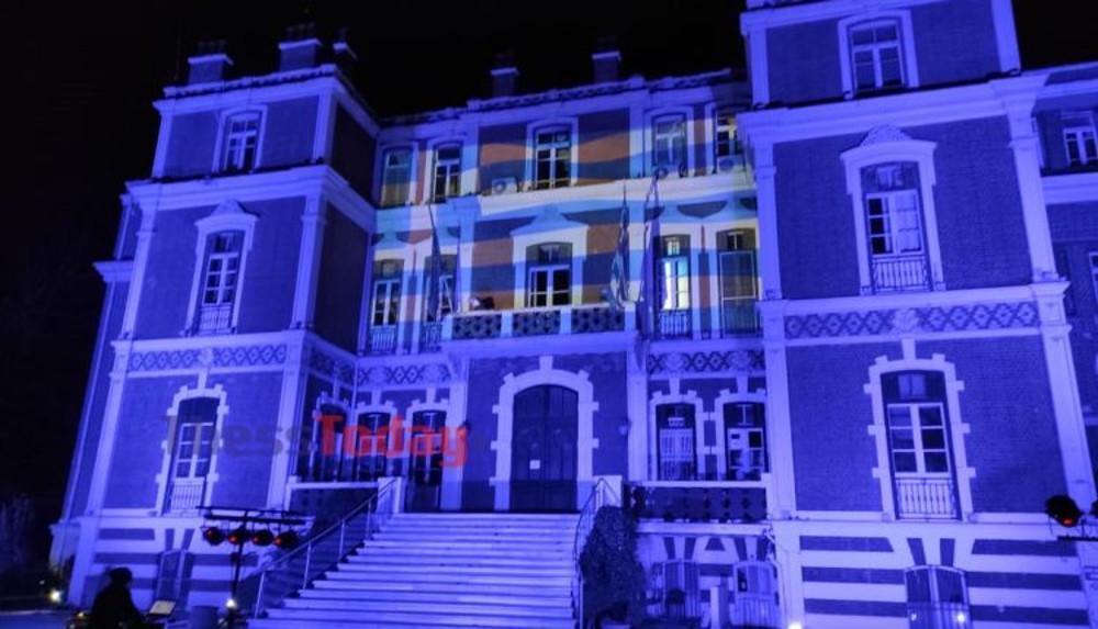 Φωταγωγημένο με δέσμες λευκού και γαλάζιου φωτός είναι από απόψε το κτήριο της διοίκησης της Περιφέρειας Κεντρικής Μακεδονίας, το γνωστό διατηρητέο κτήριο της Βίλας Αλλατίνη, ενώ στην είσοδό του προβάλλεται η ελληνική σημαία.