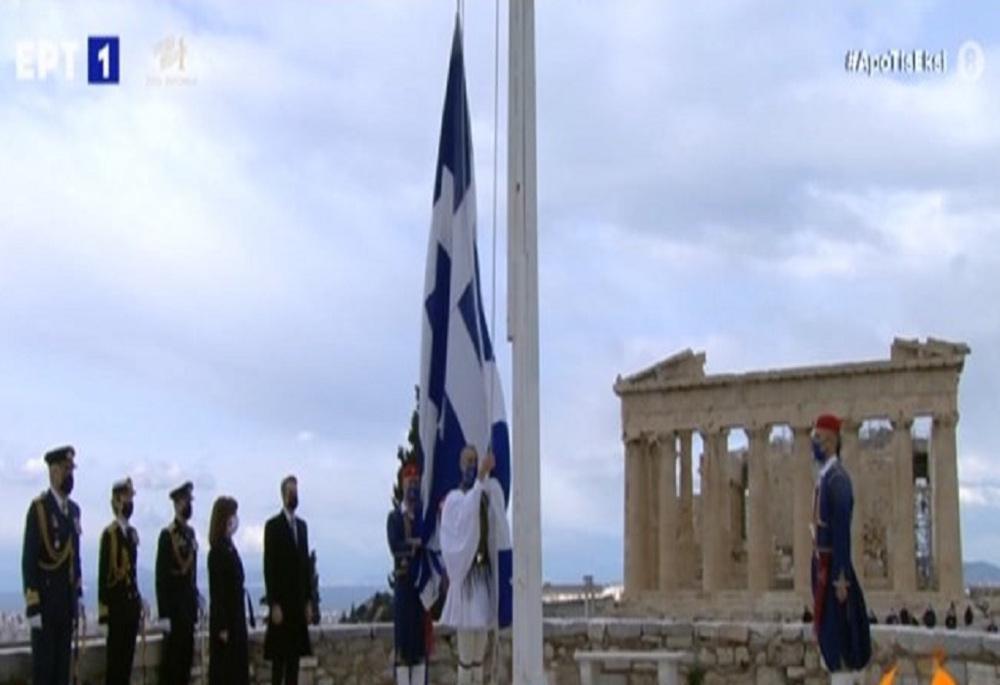 Στην τελετή έπαρσης της σημαίας στην Ακρόπολη, έδωσαν το παρών η Πρόεδρος της Δημοκρατίας Κατερίνα Σακελλαροπούλου και ο πρωθυπουργός Κυριάκος Μητσοτάκης, έψαλε τον εθνικό ύμνο η διεθνούς φήμης σοπράνο Αναστασία Ζαννή.