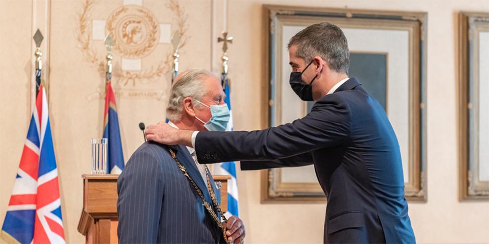 Η παρασημοφόρηση έγινε σε αναγνώριση της συνδρομής του λαού του Ηνωμένου Βασιλείου στην απελευθέρωση της Ελλάδας, αλλά και της αφοσίωσης και της συνεισφοράς του Πρίγκιπα της Ουαλίας στην προστασία του περιβάλλοντος, στην προάσπιση της πολιτιστικής κληρονομιάς και στην προώθηση των γραμμάτων και των καλών τεχνών.