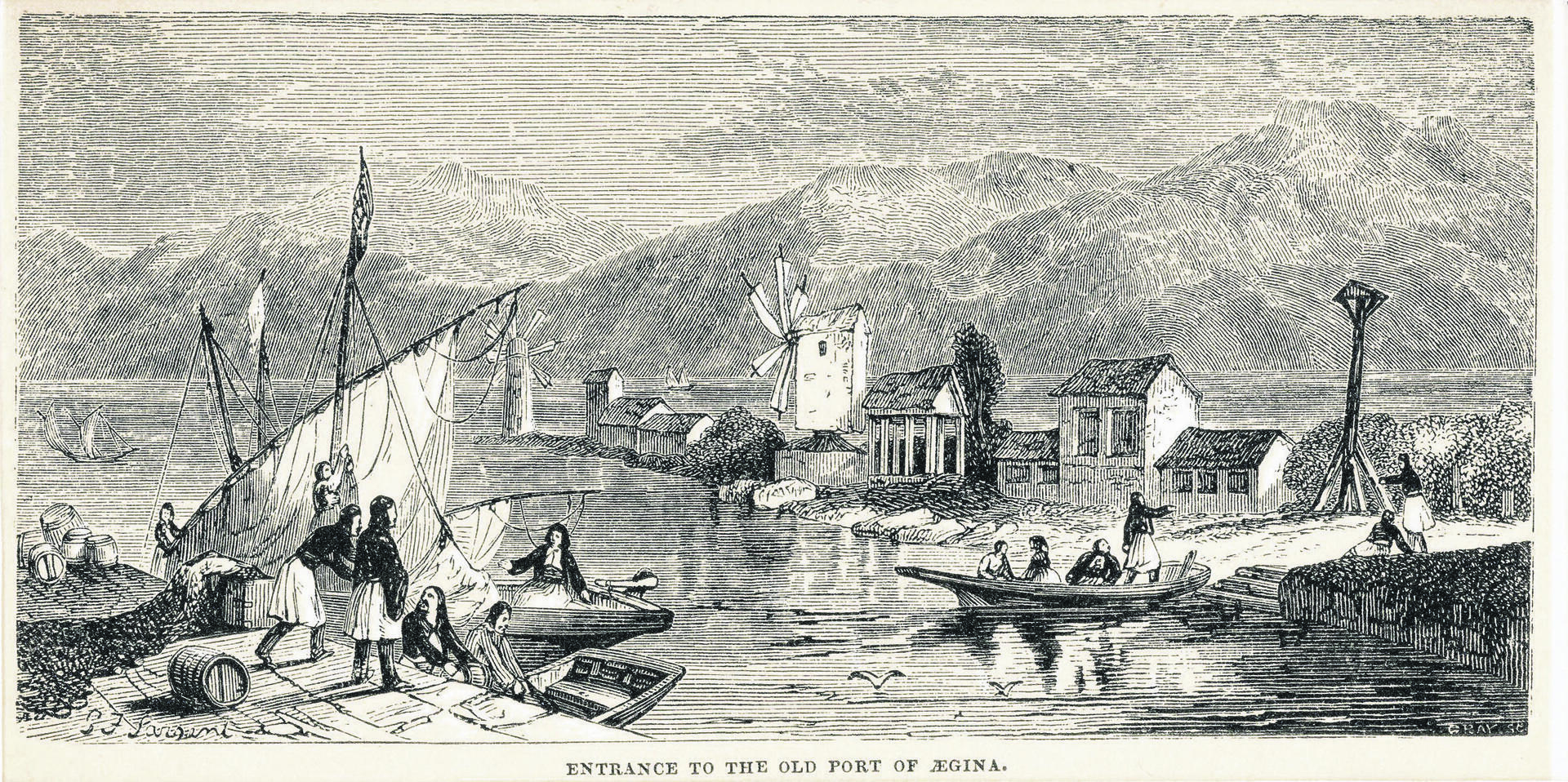 Το παλιό λιμάνι της Αίγινας. Λιθογραφία από Cristopher Wordsworth. Λονδίνο 1882. Συλλογή: Μάρω Καρδαμίτση-Αδάμη.