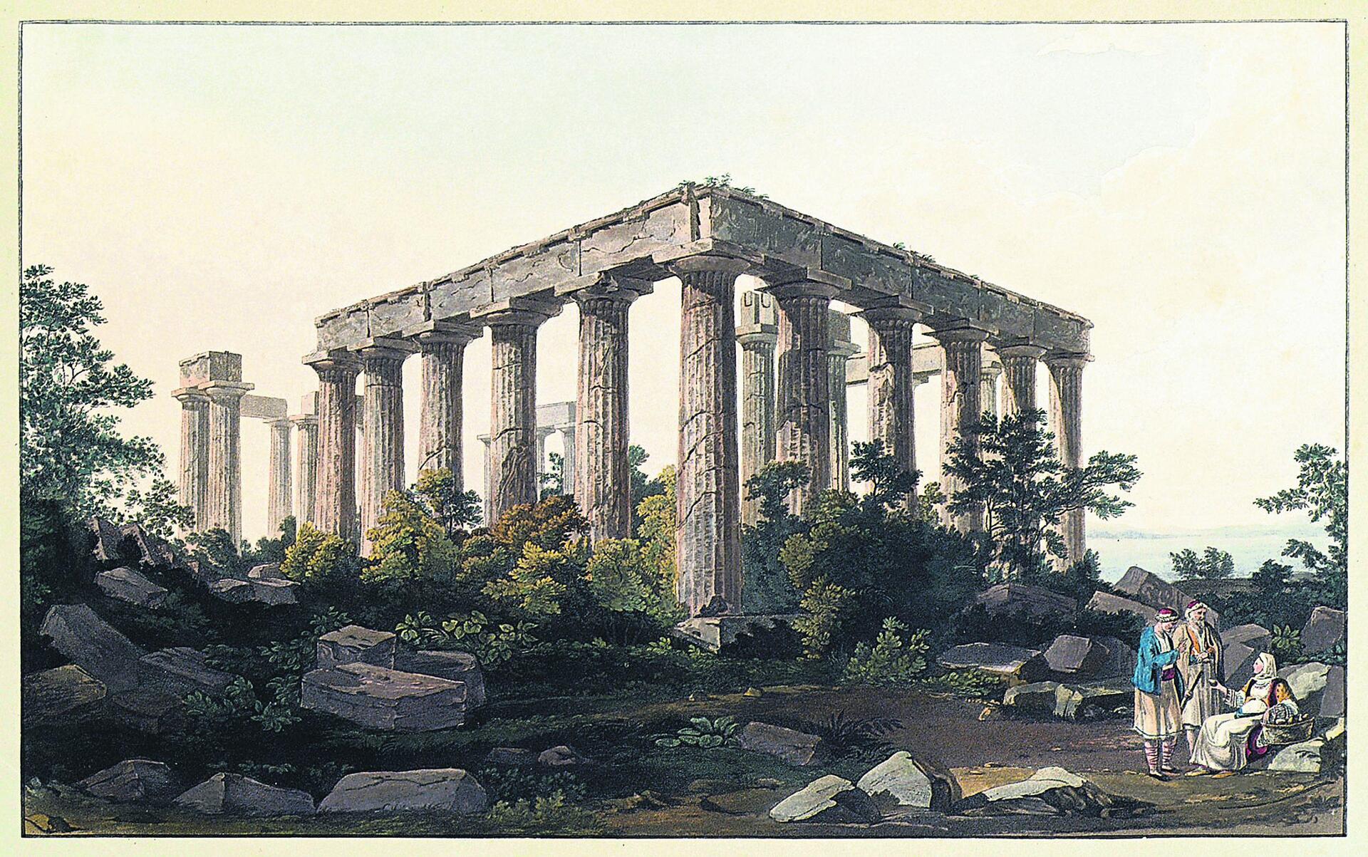 Ο ναός της Αφαίας στην Αίγινα. Απεικονίζονται οι χωρικοί της Αίγινας που τροφοδοτούσαν τους περιηγητές κατά το διάστημα που αυτοί διέμειναν στο χώρο. Ed. Dodwell 1819. Συλλογή: Γεννάδειος Βιβλιοθήκη – Αμερικανική Σχολή Κλασικών Σπουδών στην Αθήνα. Ιδρυμα Αικατερίνης Λασκαρίδη.