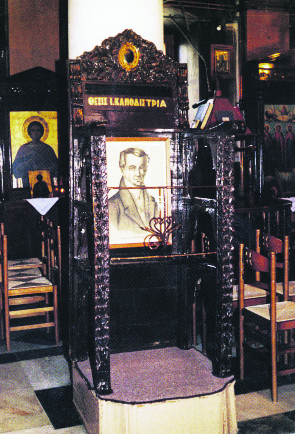 Το στασίδι του Κυβερνήτη Ιω. Καποδίστρια που ευρίσκεται στον Μητροπολιτικό Ναό στην Αίγινα. Από: Εμμανουήλ Α. Γιαννούλη, Ταξίδι στην Ιστορία, Αίγινα – «Μεγάλη Εκκλησία» – Αρχή Του Νεοελληνικού Κράτους.