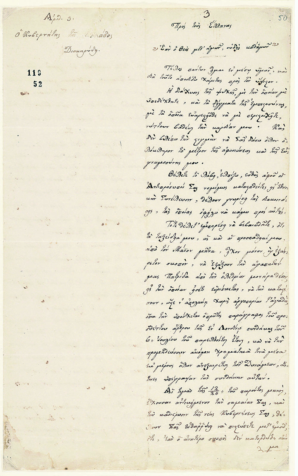 Διακήρυξη του Κυβερνήτη της Ελλάδος Ιω. Καποδίστρια προς τους Ελληνες μετά την ανάληψη των καθηκόντων του. Αίγινα 20.1.1828. Ιστορικά Αρχεία Μουσείου Μπενάκη.