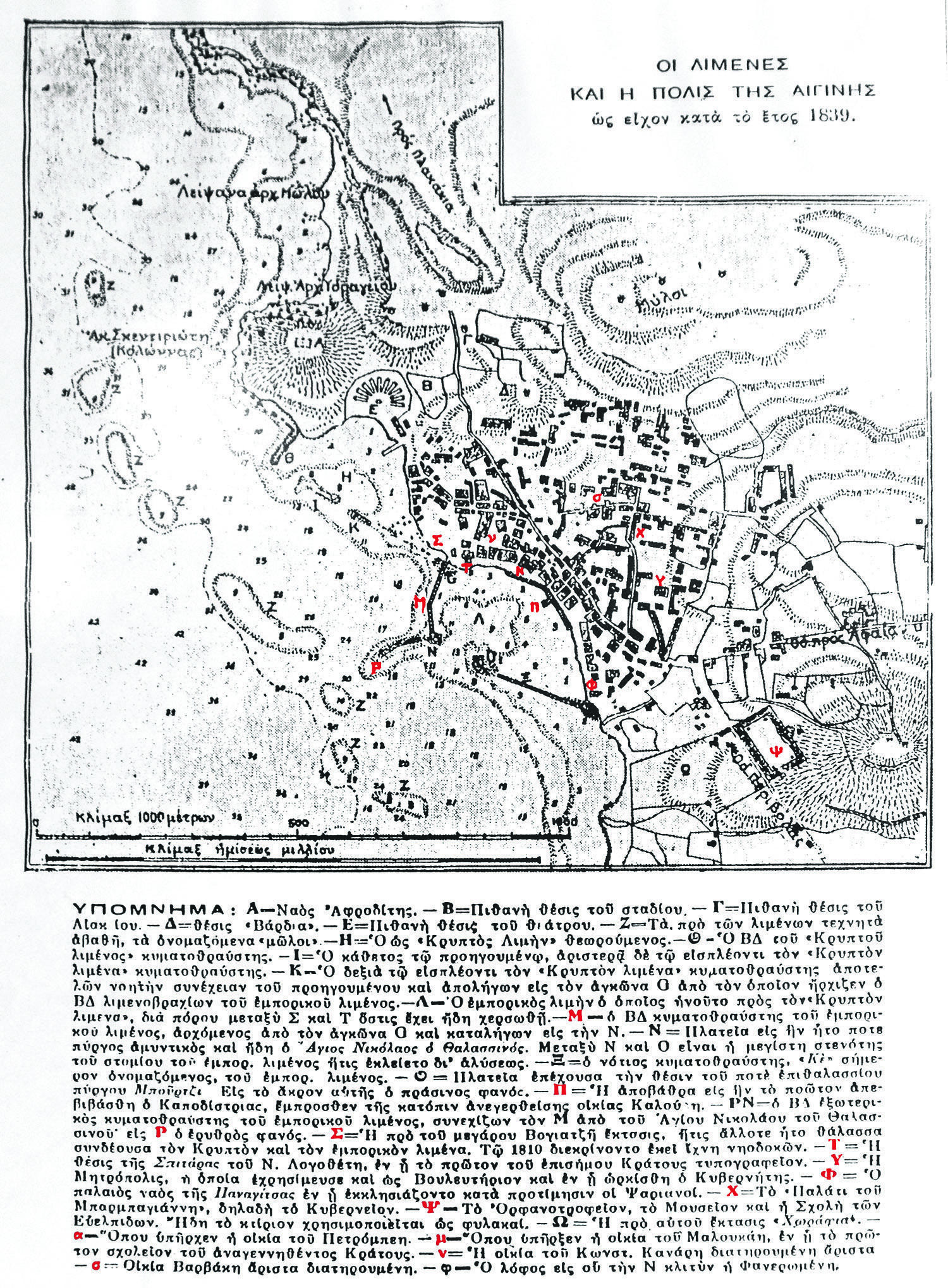 ΟΙ ΛΙΜΕΝΕΣ ΚΑΙ Η ΠΟΛΙΣ ΤΗΣ ΑΙΓΙΝΗΣ ως είχον κατά το 1839. Χάρτης του αγγλικού Ναυτικού από τον Thomas Graves. Το υπόμνημα με τις τοπογραφικές επισημάνσεις είναι, προφανώς, μεταγενέστερο.