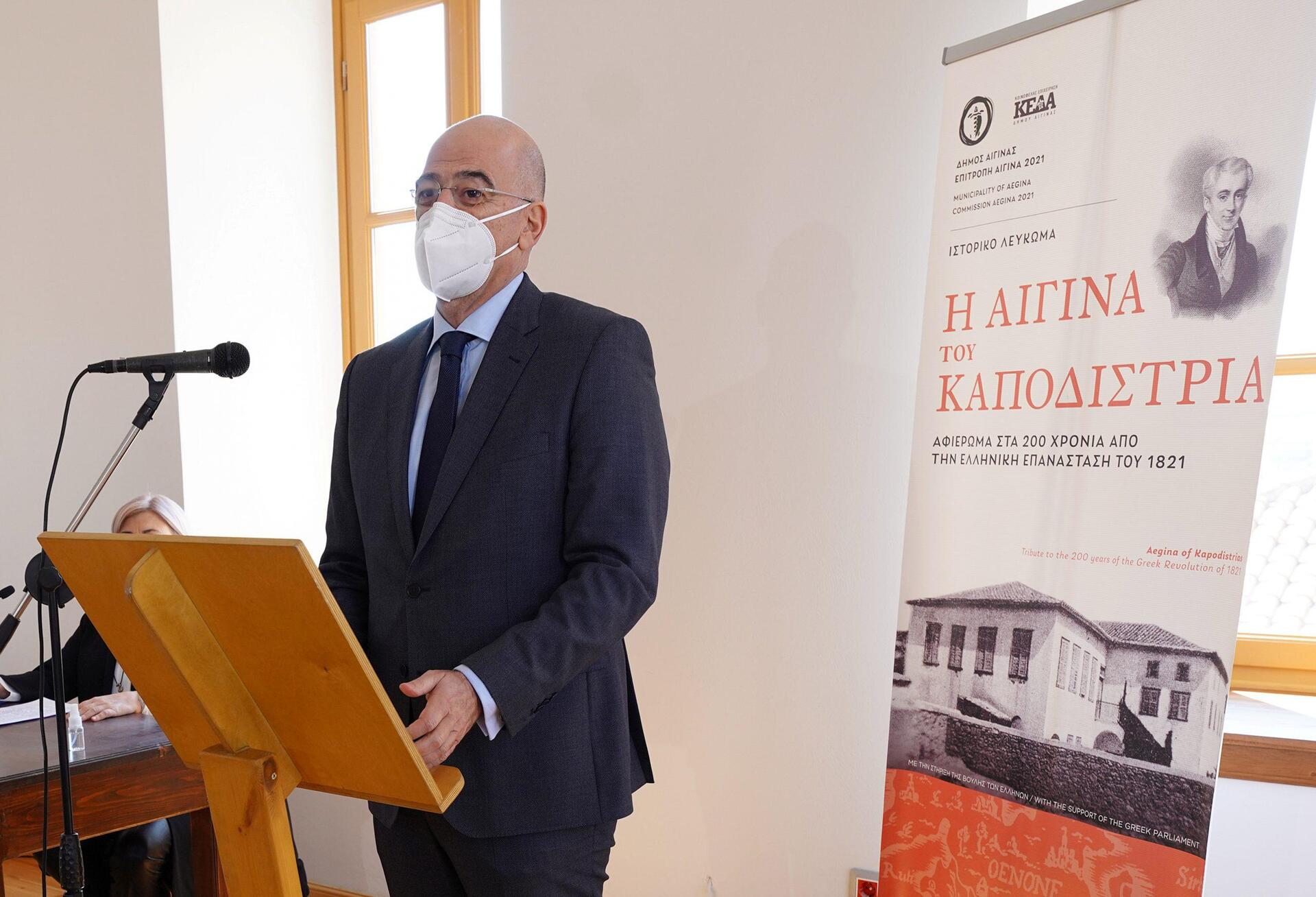 «…Η Αίγινα απετέλεσε την πρωτεύουσα στην οποία σχεδιάστηκε η νέα Ελλάδα. Αυτή την αλήθεια δυστυχώς, όπως παρατηρήθηκε με μια πικρία, μερικές φορές πολλοί στην Ελλάδα τη λησμονούμε. Είναι, λοιπόν, πολύ κρίσιμο το ιστορικό αυτό λεύκωμα να μας το θυμίσει με τον πιο καθαρό τρόπο», ανέφερε στο χαιρετισμό του ο υπουργός Εξωτερικών και εξήρε τη συμβολή και το έργο του Ιωάννη Καποδίστρια για την αναγνώριση και διαμόρφωση του ελληνικού κράτους.