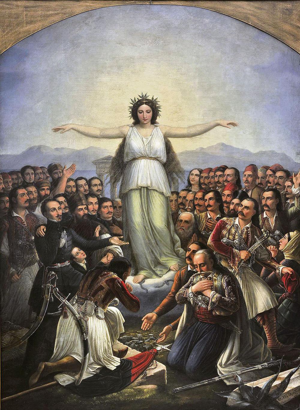 Φυσικά, «Η Ελλάς ευγνωμονούσα» και ο ζωγράφος της, ο Βρυζάκης, δεν εξαίρεσαν τους επιφανείς πολιτικούς από την απονομή του στεφάνου της αιώνιας δόξας. Συνολικά οι 48 εικονιζόμενοι και οι δύο εικονιζόμενες επανασυστήθηκαν στη νέα γενιά και την Ευρώπη ως αξιοβράβευτοι θεμελιωτές και αντιπρόσωποι του έθνους. Ως τέτοιοι αυτοσυστήνονταν και οι ίδιοι οι επιζώντες επιφανείς του Αγώνα μέσα από πορτρέτα, τα οποία επιβεβαιώνουν τόσο την κοινωνική θέση όσο και τις βραβεύσεις τους.