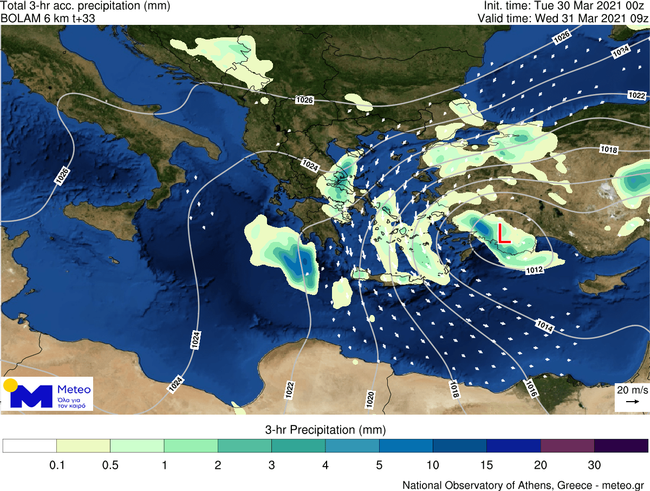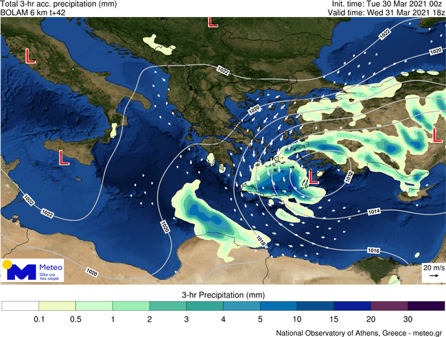 Όσον αφορά στους ενισχυμένους ανέμους κατά τη διάρκεια της Τετάρτης 31/03, στον προγνωστικό χάρτη που ακολουθεί, παρουσιάζονται με βέλη οι επικρατούσες διευθύνσεις των ανέμων, ενώ οι κόκκινες αποχρώσεις και οι αναγραφόμενες τιμές αποτυπώνουν τις εκτιμώμενες μέγιστες εντάσεις τους.