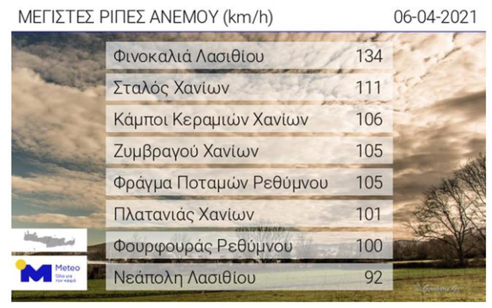 Το δίκτυο των αυτόματων μετεωρολογικών σταθμών του Εθνικού Αστεροσκοπείου Αθηνών / meteo.gr στην Κρήτη κατέγραψε τις ισχυρότερες ριπές ανέμου έως το πρωί σήμερα στη Φινοκαλιά Λασιθίου (134 χλμ/ώρα) και στο Σταλό Χανίων (111 χλμ/ώρα).