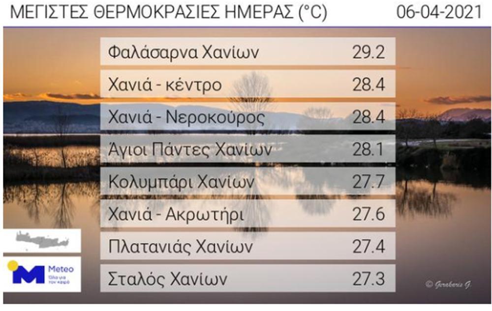 Η υψηλότερη θερμοκρασία σημειώθηκε το πρωί στα Φαλάσαρνα Χανίων, όπου έφθασε τους 29,2 βαθμούς Κελσίου. Ακολούθησαν το κέντρο της πόλης και ο Νεροκούρος Χανίων(από 28,4), οι Άγιοι Πάντες Χανίων (28,1), το Κολυμπάρι (27,6) και το Ακρωτήρι Χανίων (27,6).