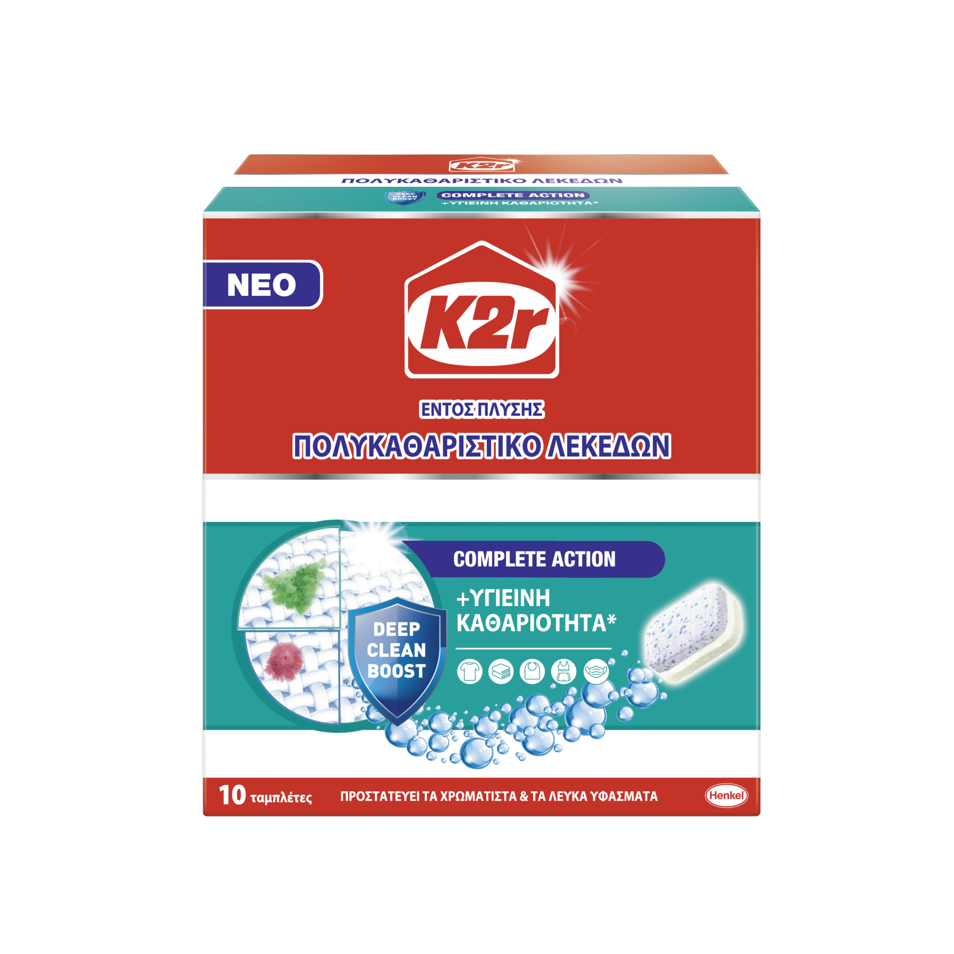 Η 2σε1 Χρωμοπαγίδα® Κ2r Colour Catcher & Υγιεινή καθαριότητα, αλλά και το νέο K2r πολυκαθαριστικό λεκέδων & Υγιεινή καθαριότητα στην καινοτόμο μορφή ταμπλέτας, προσφέρουν την αποτελεσματικότητα και την ασφάλεια που αναζητούμε σε κάθε μας πλύση! Και τα δύο προϊόντα περιέχουν τη φόρμουλα DEEP CLEAN BOOST για εγγυημένη δράση κατά των λεκέδων. Η νέα 2 σε 1 Χρωμοπαγίδα® Κ2r Colour Catcher & Υγιεινή καθαριότητα αποτελείται απο φακελάκια που προσφέρουν διπλή δράση: 1) αποτρέπουν τα ατυχήματα αποχρωματισμού, καθώς το φύλλο λειτουργεί σαν μαγνήτης και δεσμεύει τα χρώματα που απελευθερώνονται κατά την πλύση και 2) με την ειδική της σύσταση, η σκόνη που εμπεριέχεται στο φακελάκι, δρα αποτελεσματικά εναντίων των λεκέδων ενώ προσφέρει υγιεινή καθαριότητα στην πλύση. Οι νέες ταμπλέτες K2r πολυκαθαριστικό λεκέδων & Υγιεινή καθαριότητα, αποτελούν την καλύτερη λύση για την αποτελεσματική αφαίρεση και των πιο δύσκολων λεκέδων, όπως make-up, ντομάτα, λίπη κλπ, ενώ παράλληλα, χάρη στα ενεργά συστατικά που απελευθερώνονται στο βάθος των ινών, προσφέρει υγιεινή καθαριότητα για όλα τα υφάσματα, είτε σε χρωματιστά είτε σε λευκά ρούχα.