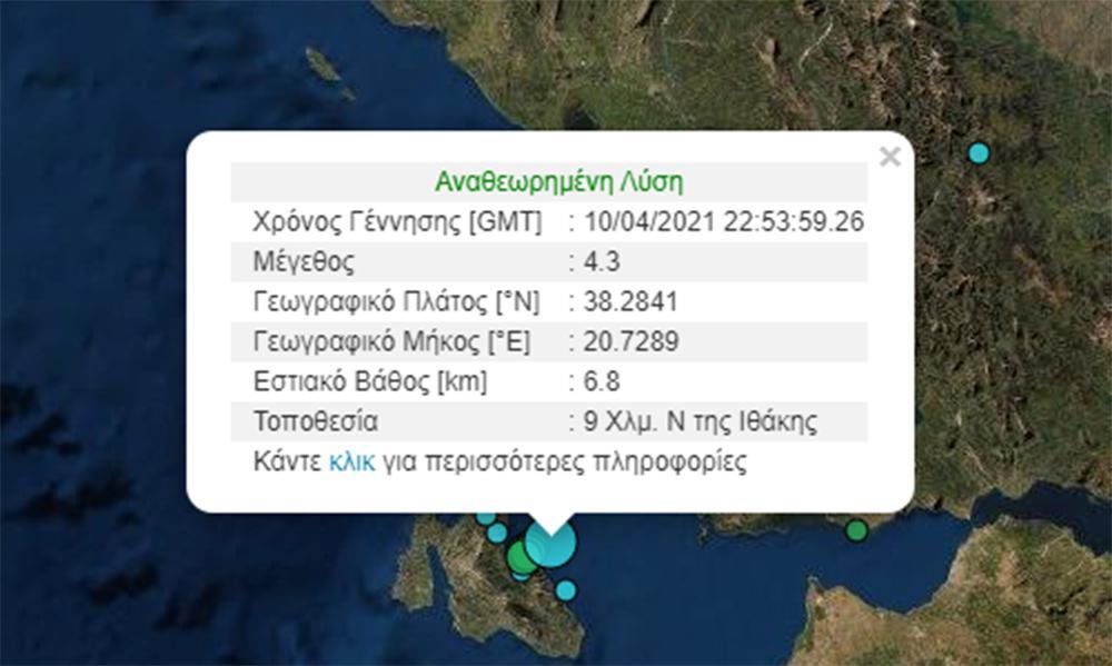 Όπως αναφέρεται στην ανακοίνωση, ο σεισμός έγινε σε απόσταση 269 χλμ Δυτικά των Αθηνών, με το επίκεντρο της δόνησης να εντοπίζεται 9 χλμ. νότια της πόλης της Ιθάκης και το βάθος του σεισμού υπολογίζεται στα 6,8 χιλιόμετρα.