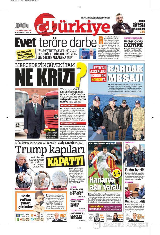 Η εφημερίδα TÜRKİYE έχει τίτλο στο πρωτοσέλιδό της Μήνυμα Καρντάκ (Ύμια) και επεξηγεί πως το μήνυμα είναι «Για τα μέλη της τρομοκρατικής οργάνωσης FETÖ τα οποία προστατεύει η γειτονική χώρα».