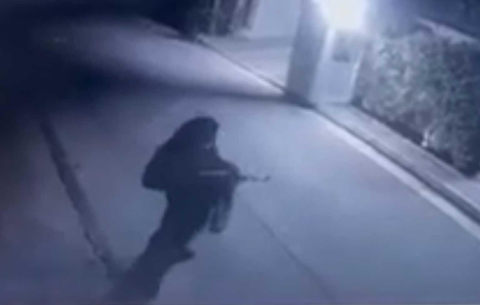 Το βίντεο δείχνει τον δράστη να βγάζει από μια τσάντα το όπλο (πιθανότατα καλάσνικοφ) και να πυροβολεί την πύλη του σπιτιού.