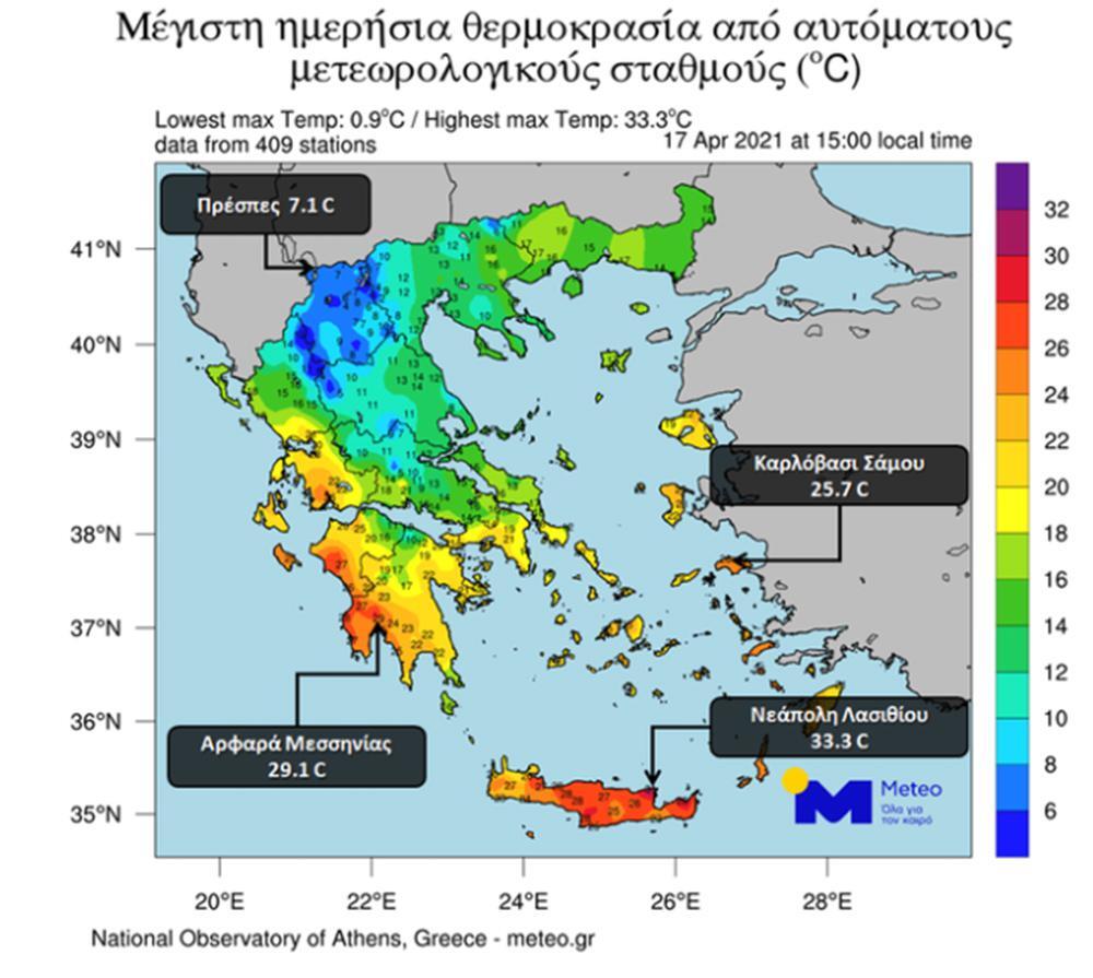 Συγκεκριμένα, σύμφωνα με το δίκτυο των αυτόματων μετεωρολογικών σταθμών του Εθνικού Αστεροσκοπείου Αθηνών/meteo.gr, το Σάββατο νωρίς το απόγευμα (ώρα 15:00) στις Πρέσπες η μέγιστη θερμοκρασία ήταν μόνο 7,1 βαθμοί, ενώ στη Νεάπολη Λασιθίου έφθασε τους 33,3 βαθμούς Κελσίου.