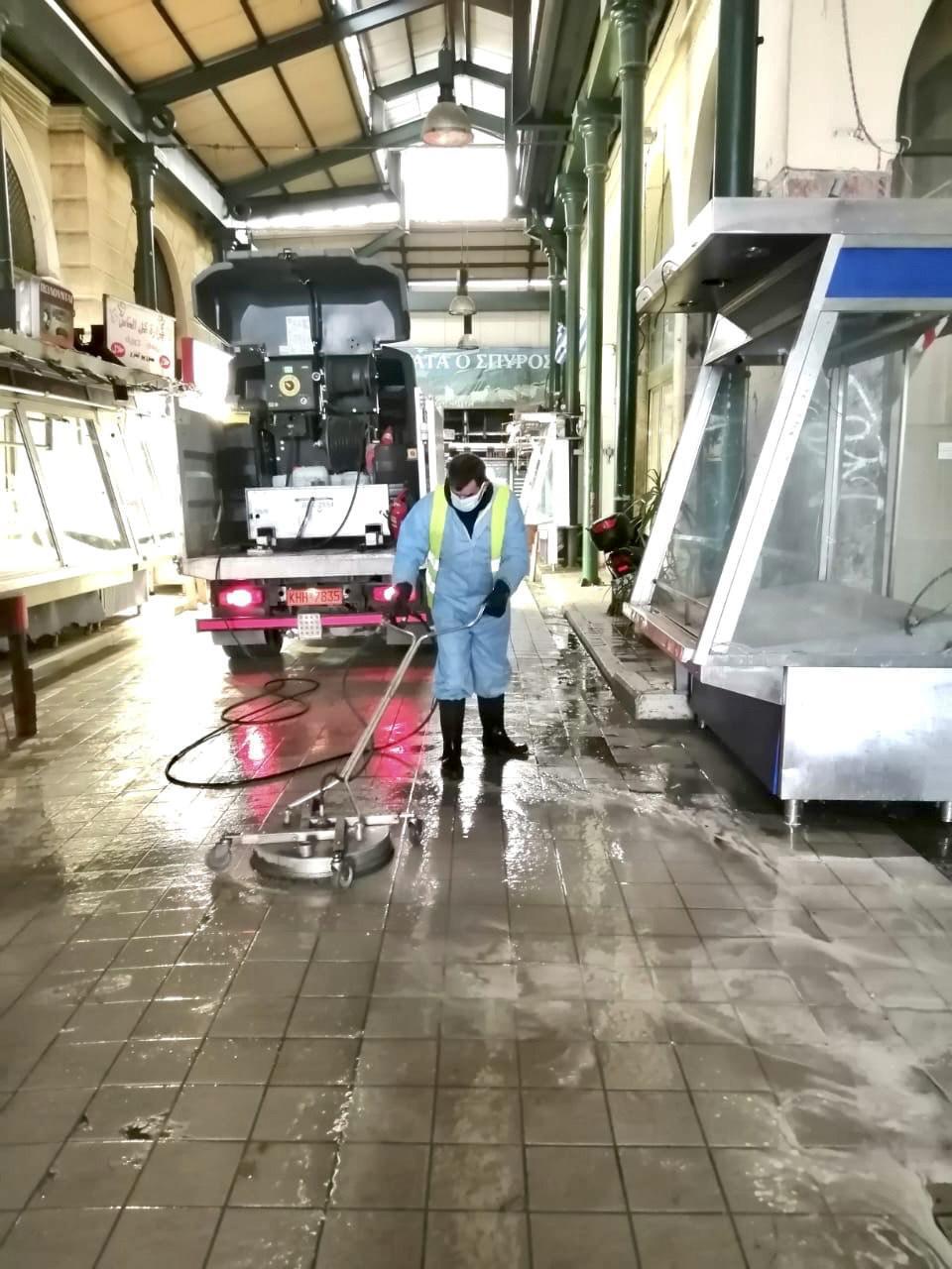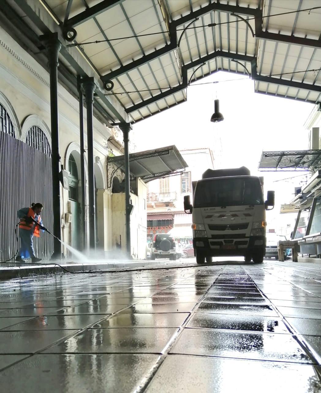 Από νωρίς το πρωί, 20 εργαζόμενοι της Διεύθυνσης Καθαριότητας με τη συνδρομή σύγχρονων μηχανημάτων καθαρισμού έπλυναν την άδεια, λόγω κυριακάτικης αργίας, αγορά, ενώ πραγματοποίησαν μεγάλη επιχείρηση απολύμανσης σε όλους τους χώρους της. Όπως αναφέρεται σε σχετική ανακοίνωση του Δήμου, χρησιμοποιώντας ζεστό νερό και ειδικά απολυμαντικά “σάρωσαν” τους εσωτερικούς χώρους και τα πατώματα, απομάκρυναν υπολείμματα μεικτών απορριμμάτων και απολύμαναν το σύνολο των επιφανειών, ώστε εργαζόμενοι, επαγγελματίες και επισκέπτες να είναι όσο το δυνατόν πιο ασφαλείς.