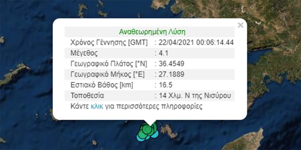 Το επίκεντρο της δόνησης εντοπίζεται στον θαλάσσιο χώρο 14 χλμ. νότια της πόλης της Νισύρου.