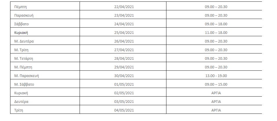 “Το προτεινόμενο Πασχαλινό ωράριο λειτουργίας των εμπορικών καταστημάτων στον Πειραιά, που θα ισχύσει από την Πέμπτη 22 Απριλίου έως και το Μ. Σάββατο 1 Μαΐου 2021, είναι το ακόλουθο:
