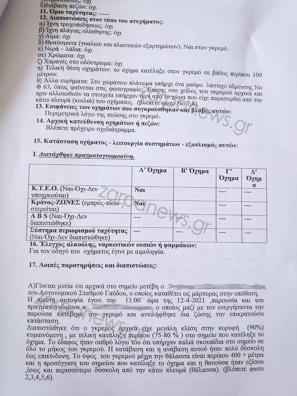 Το zarpanews.gr εξασφάλισε και παρουσιάζει την έκθεση της αστυνομίας για το θανατηφόρο συμβάν, με τους αστυνομικούς να δοκιμάζουν στην πράξη την εκδοχή που υποστηρίζει ο 40χρονος οδηγός που επιβίωσε της πτώσης. Η δοκιμή των αστυνομικών, φαίνεται να καταρρίπτει τα όσα είχε ισχυριστεί ο 40χρονος, για το τροχαίο στη Γαύδο, ότι δηλαδή το χειρόφρενο λύθηκε και έτσι κατέληξε το αμάξι στον γκρεμό.