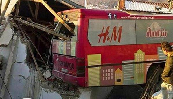 Στη χειρότερη θέση βρέθηκε η 14χρονη μαθήτρια του Γυμνασίου, η οποία παρασύρθηκε από το λεωφορείο, έπεσε στο έρεισμα του δρόμου, πίσω από τα κάγκελα και τραυματίστηκε σοβαρά ενώ στη συνέχεια το όχημα κατέληξε σε κατοικία, την οποία διαπέρασε καταστρέφοντας την σε μήκος 3 μέτρων.