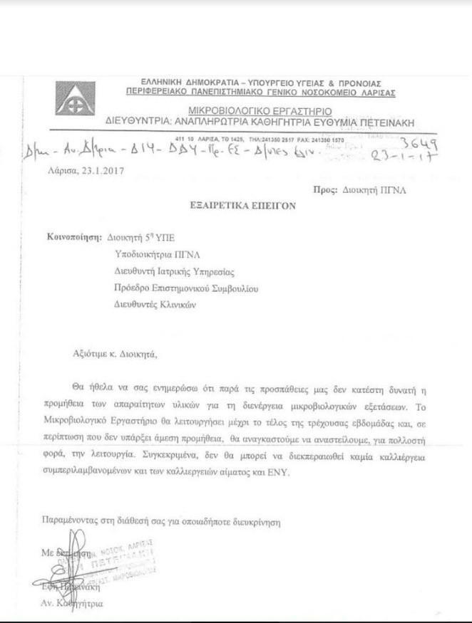 Την ίδια στιγμή, και σύμφωνα με την ΠΟΕΔΗΝ, «λουκέτο» μπήκε για μια ακόμη φορά στο Μικροβιολογικό εργαστήριο του Πανεπιστημιακού Γενικού Νοσοκομείου Λάρισας, λόγω της έλλειψης των αναγκαίων αντιδραστηρίων, των υλικών που απαιτούνται για τις μικροβιολογικές εξετάσεις. Όπως είχε ενημερώσει με έγγραφό της τη διοίκηση του νοσοκομείου την περασμένη εβδομάδα η υπεύθυνη για τη λειτουργία του «δεν θα διενεργούνται μικροβιολογικές εξετάσεις ούτε καλλιέργειες, συμπεριλαμβανομένων των καλλιεργειών αίματος».