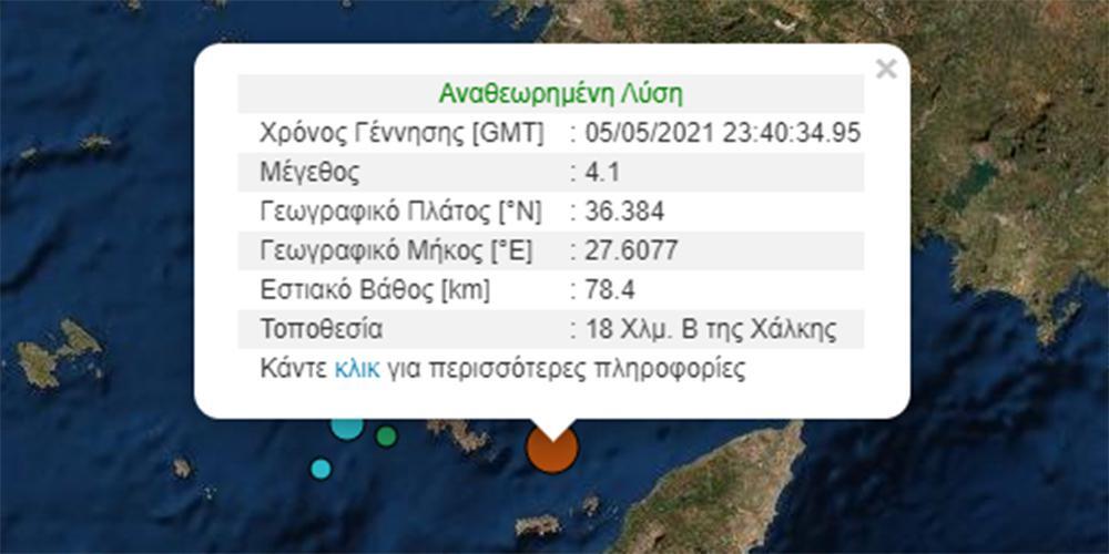 Το επίκεντρο της δόνησης εντοπίζεται στον θαλάσσιο χώρο 18 χλμ. βόρεια της πόλης της Χάλκης, σε απόσταση 387 χλμ. ανατολικά/νοτιοανατολικά των Αθηνών.