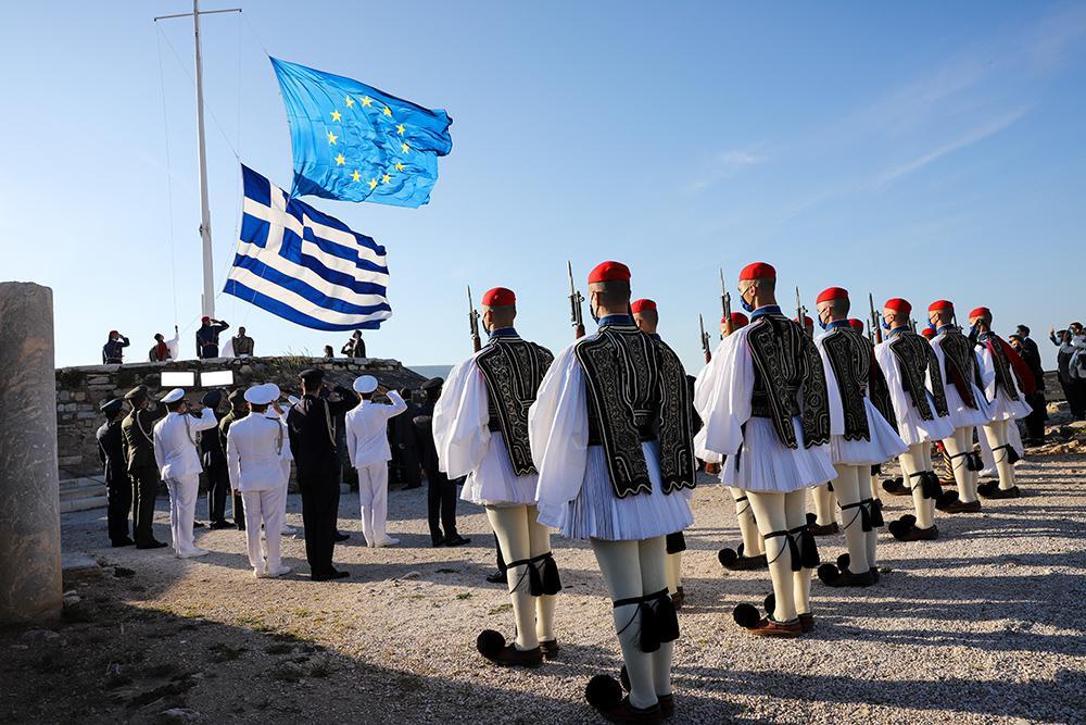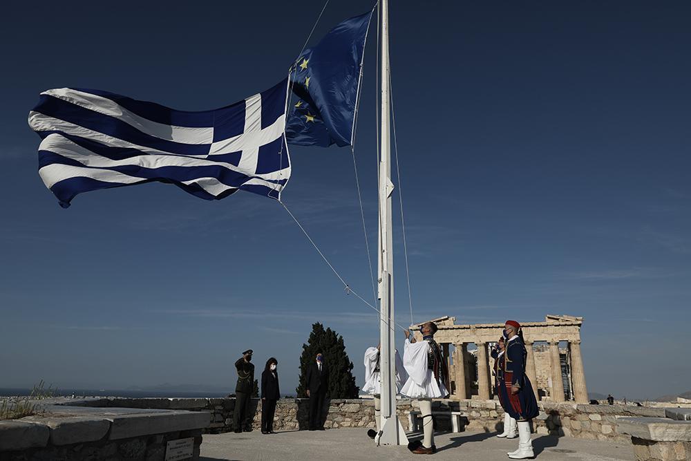 «Στην Τελετή Έπαρσης των Σημαιών Ελλάδας και Ευρώπης στον Ιερό Βράχο της Ακρόπολης, σύμβολο της Δημοκρατίας, για τον εορτασμό της Ημέρας της Ευρώπης και τα 40 χρόνια από την ένταξη της Ελλάδας στην Ε.Ε, παρουσία της Α.Ε της Προέδρου της Δημοκρατίας. Χρόνια Πολλά Ευρώπη!» συμπλήρωσε ο κ. Βαρβιτσιώτης.