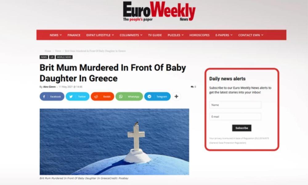 Νεαρή μητέρα δολοφονήθηκε μπροστά στην κορούλα της στην Ελλάδα, είναι ο τίτλος της ιστοσελίδας «euroweeklynews».