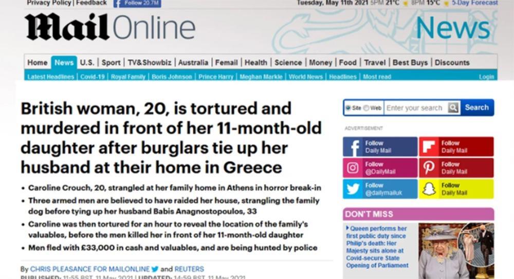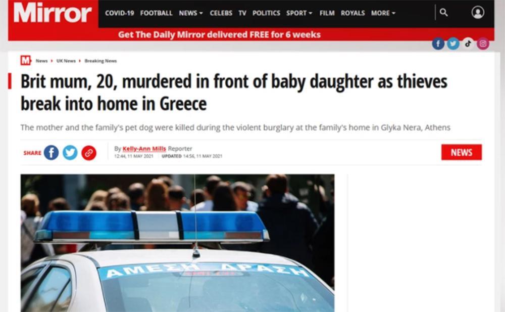 Βρετανίδα γυναίκα, 20 ετών, βασανίστηκε και δολοφονήθηκε μπροστά στην 11 ετών κόρη αφού διαρρήκτες έδεσαν τον σύζυγό της στο σπίτι τους στην Ελλάδα είναι ο τίτλος δημοσιεύματος του Daily Mail. Στο άρθρο αναφέρεται ότι η γυναίκα βασανίστηκε για μια ώρα προκειμένου να αποκαλύψει πού είχαν κρυμμένα πολύτιμα αντικείμενα στο σπίτι, πριν τη σκοτώσουν μπροστά στην 11 μηνών κόρη της.