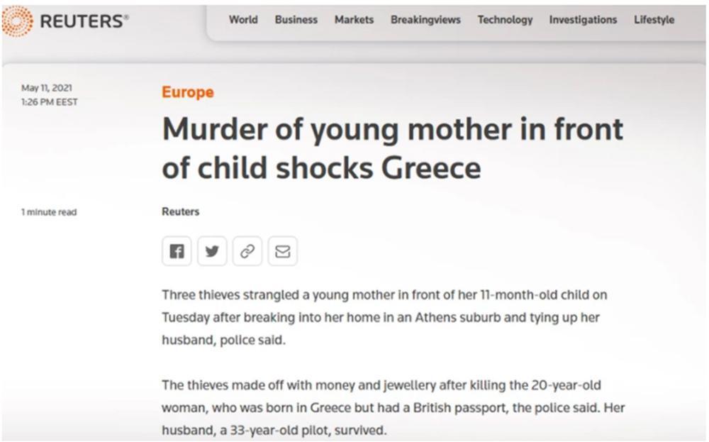 Δολοφονία νεαρής μητέρας μπροστά στο παιδί της σοκάρει την Ελλάδα είναι ο τίτλος του άρθρου στο Reuters, το οποίο αναφέρεται ότι τρεις ληστές εισέβαλαν σε σπίτι σε προάστια της Αθήνας, στραγγάλισαν τη μητέρα μπροστά στο παιδί της και έδεσαν τον άνδρα.