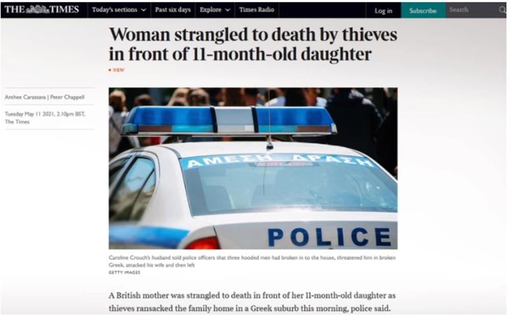 Οι Times σε άρθρο με τίτλο «Γυναίκα στραγγαλίστηκε από ληστές μπροστά στην 11 μηνών κόρης της» αναφέρουν πως τρεις διαρρήκτες βασάνισαν 20χρονη γυναίκα στο σπίτι της στα Γλυκά Νερά όπου κοιμόταν μαζί με το μωρό της, αναφέροντας πως η γυναίκα είχε γεννηθεί στην Ελλάδα αλλά είχε βρετανικό διαβατήριο.