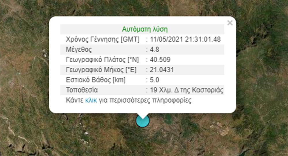 Το επίκεντρο του σεισμού εντοπίστηκε στα 19 χιλιόμετρα δυτικά της Καστοριάς, ενώ το εστιακό βάθος μετρήθηκε στα πέντε χιλιόμετρα, σύμφωνα με το Γεωδυναμικό Ινστιτούτο.