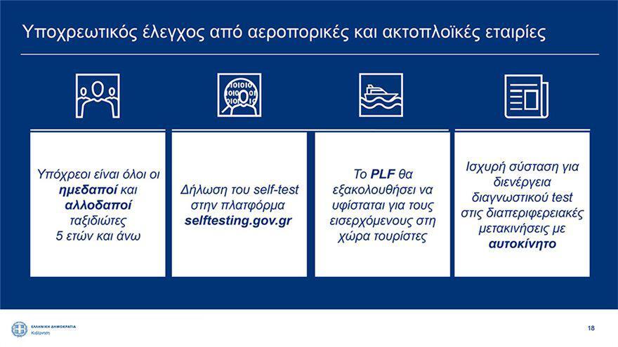 Στην ηπειρωτική Ελλάδα η μετακίνηση θα γίνεται χωρίς την υποχρέωση για self test, κάτι που, ωστόσο, θα συστήνεται σε όσους ταξιδέψουν.