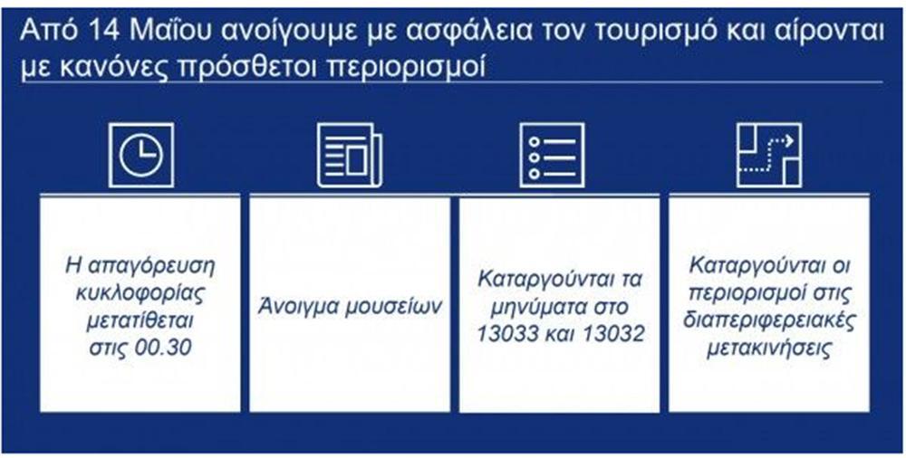 Το ωράριο ελεύθερης κυκλοφορίας παρατείνεται μέχρι τις 00:30. Αντίστοιχα θα παραταθεί και το ωράριο λειτουργίας των χώρων της εστίασης, οι οποίοι θα κλείνουν μισή ώρα πριν από το απαγορευτικό.