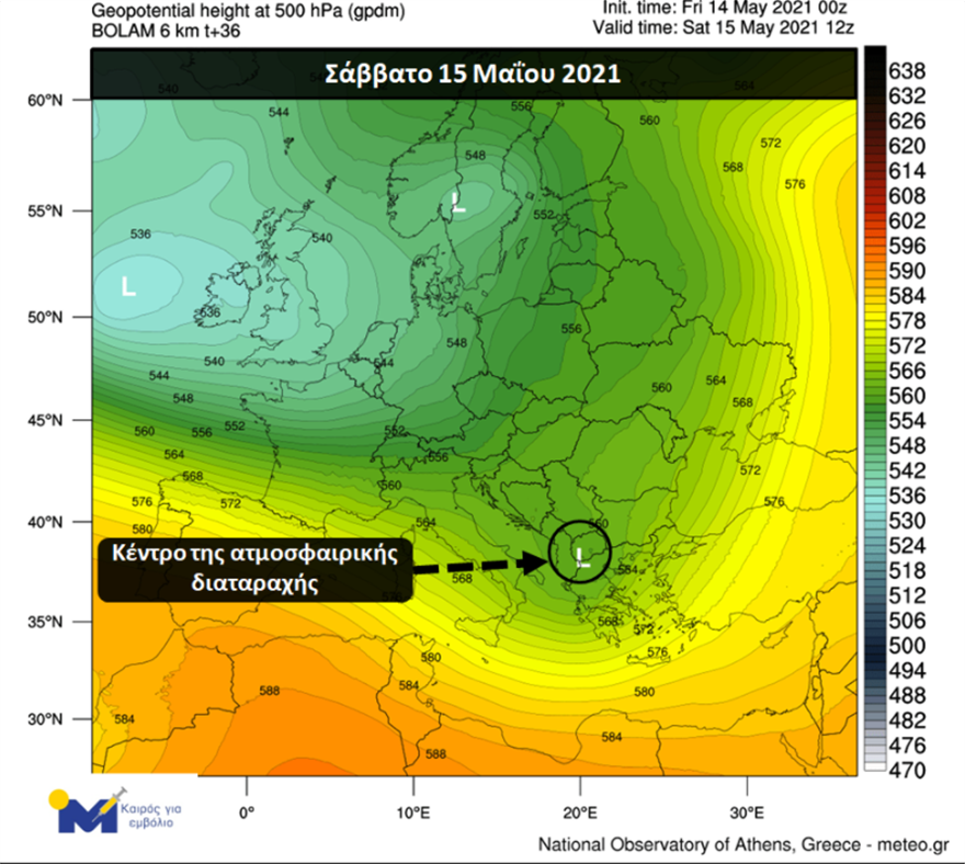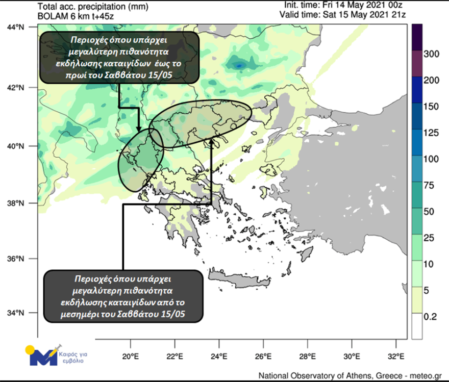 Στη φωτογραφία που ακολουθεί παρουσιάζεται ο ολικός υετός (βροχές/καταιγίδες) που αναμένεται έως το βράδυ του Σαββάτου 15/05 καθώς και οι περιοχές όπου υπάρχει μεγαλύτερη πιθανότητα εκδήλωσης καταιγίδων.