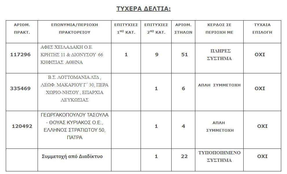 Ο μεγάλος τυχερός είχε, επίσης, 9 επιτυχίες στη 2η κατηγορία όπου η κάθε επιτυχία κερδίζει από 6.562,66 ευρώ.