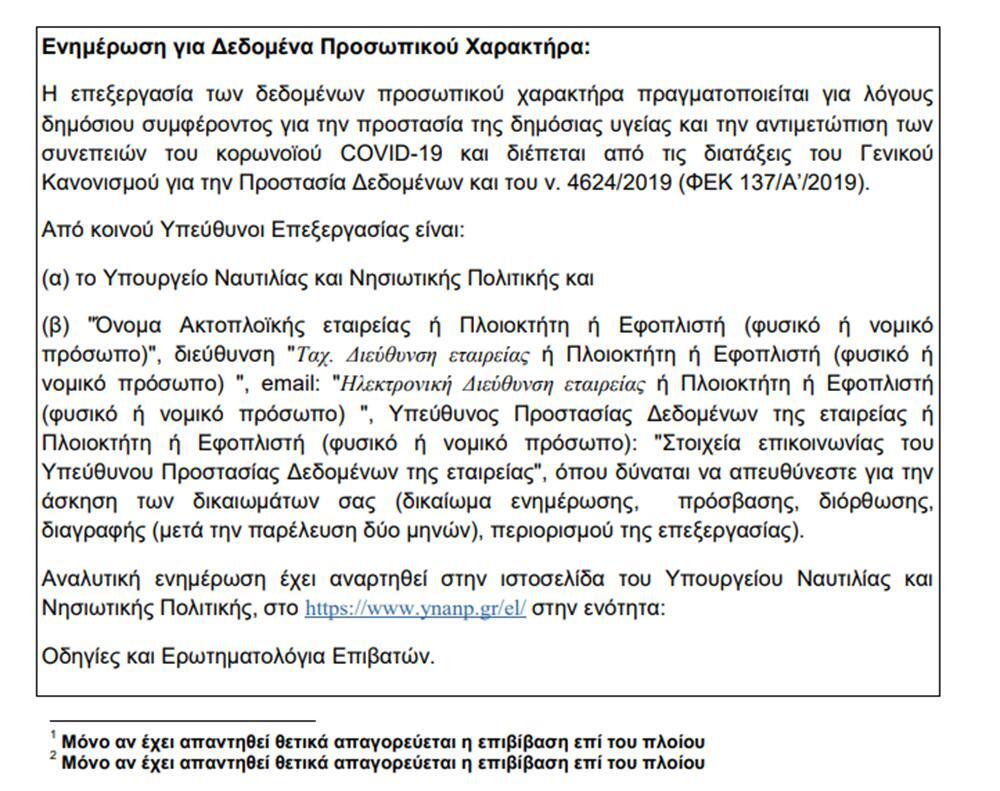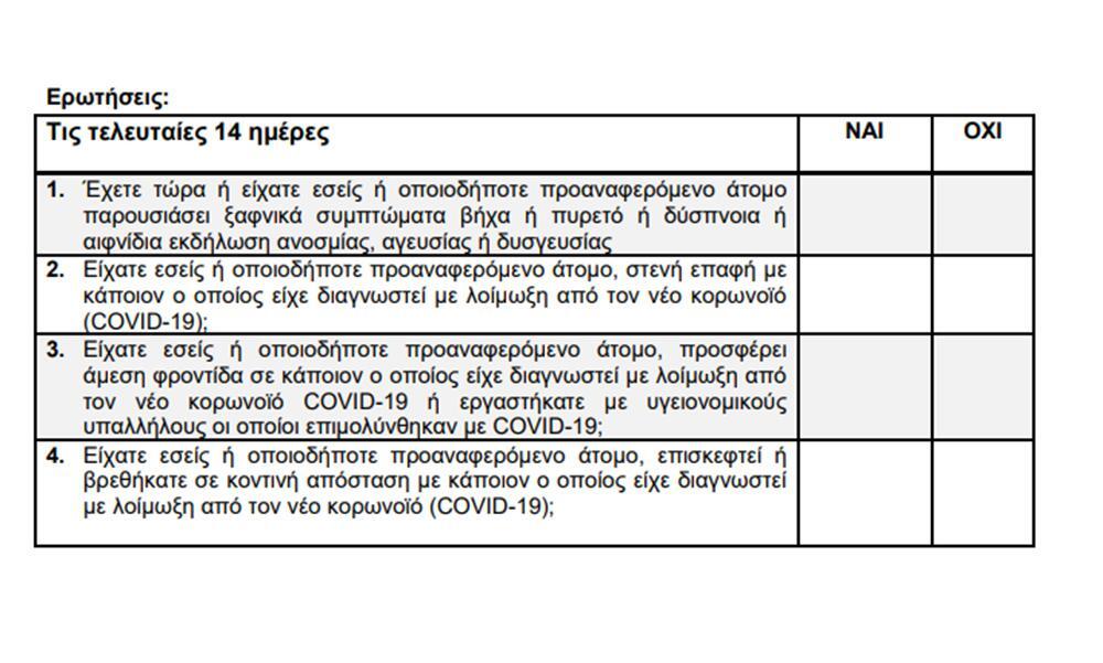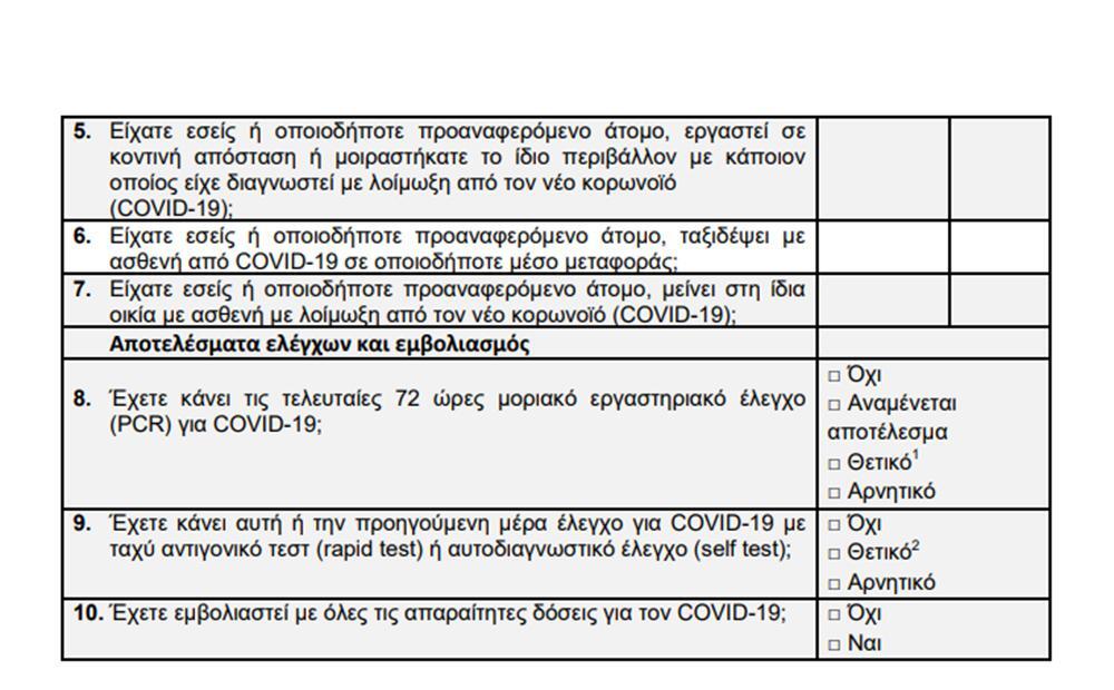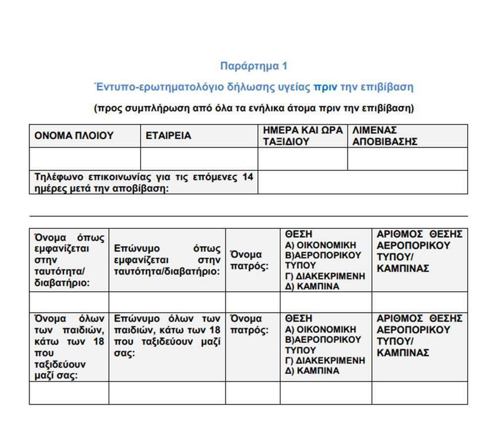 Πρόκειται για τη «Δήλωση υγείας πριν την επιβίβαση» που περιλαμβάνει ερωτήσεις όπως για το αν ο επιβάτης είχε εκδηλώσει συμπτώματα κορωνοϊού τις τελευταίες 14 ημέρες, αν έχει έρθει σε επαφή με κρούσμα, αν έχει κάνει μοριακό, rapid ή self test και αν έχει εμβολιαστεί με τη μια ή με τις δύο δόσεις του εμβολίου.