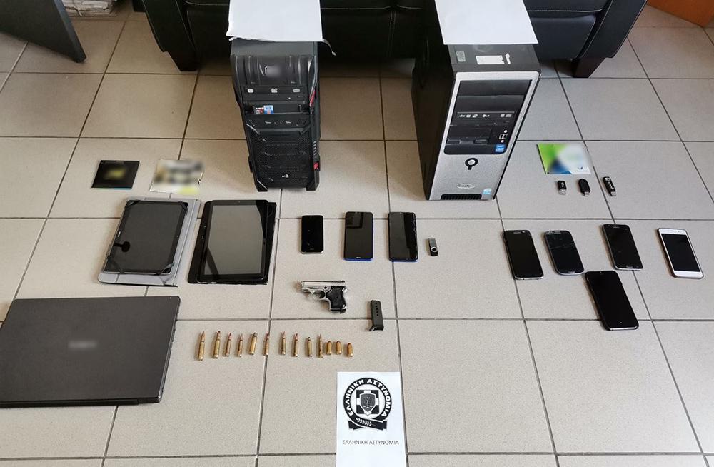 Κατά τη διάρκεια των ερευνών στα σπίτια των συλληφθέντων βρέθηκαν επτά κάρτες κινητής τηλεφωνίας, ηλεκτρονικοί υπολογιστές, οκτώ συσκευές κινητών τηλεφώνων και τέσσερις μονάδες αποθήκευσης. Επιπλέον, στο σπίτι του 23χρονου βρέθηκαν ένα πιστόλι και 13 φυσίγγια διαφόρων τύπων και διαμετρημάτων.