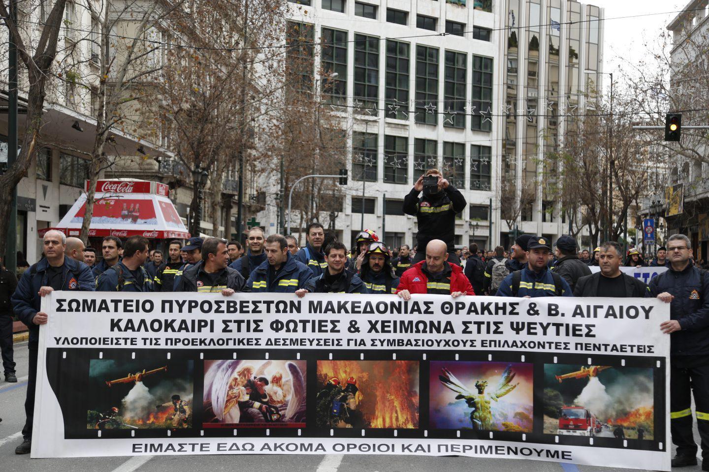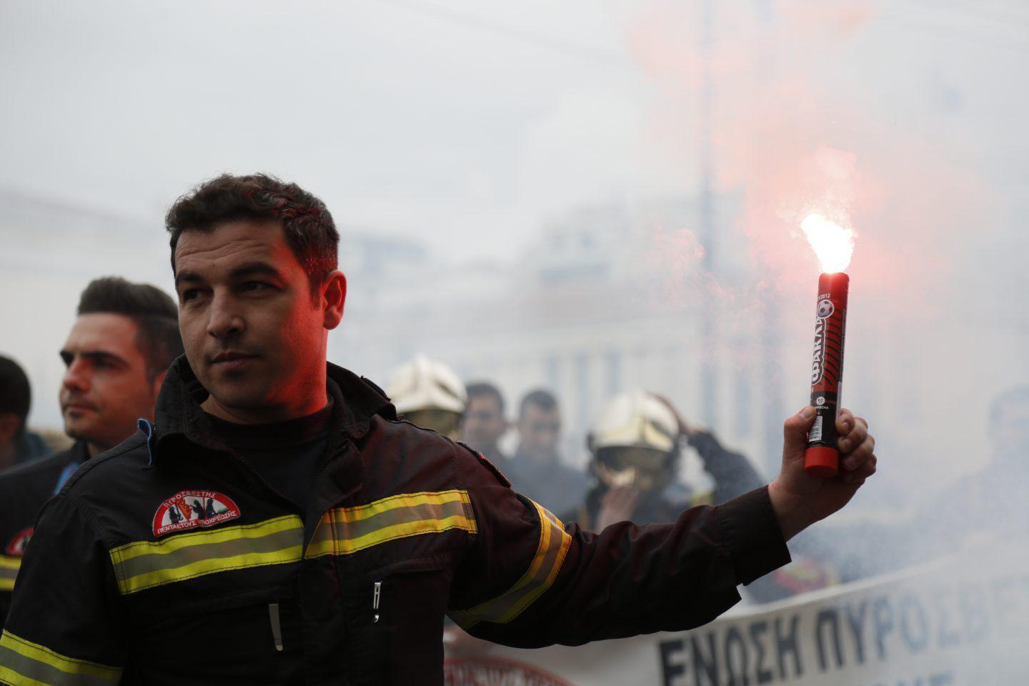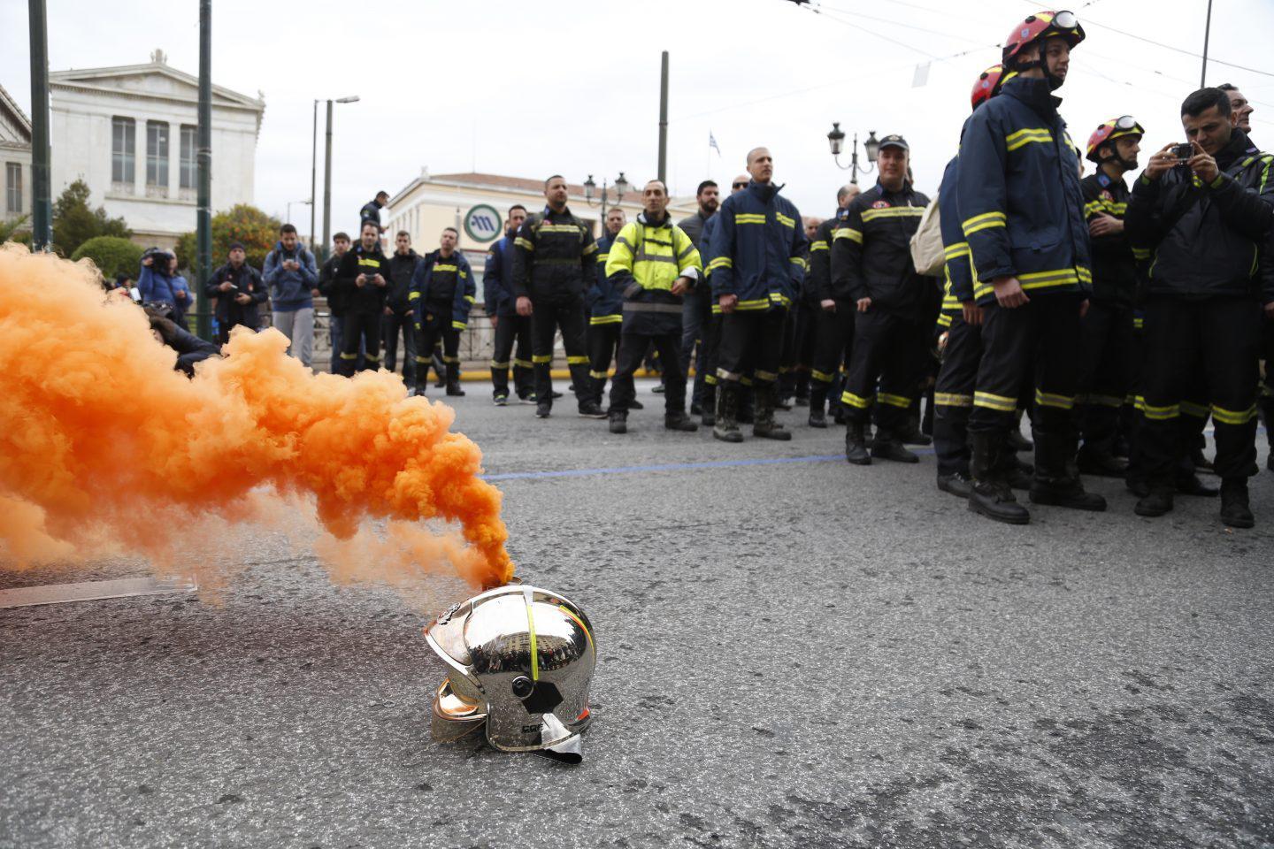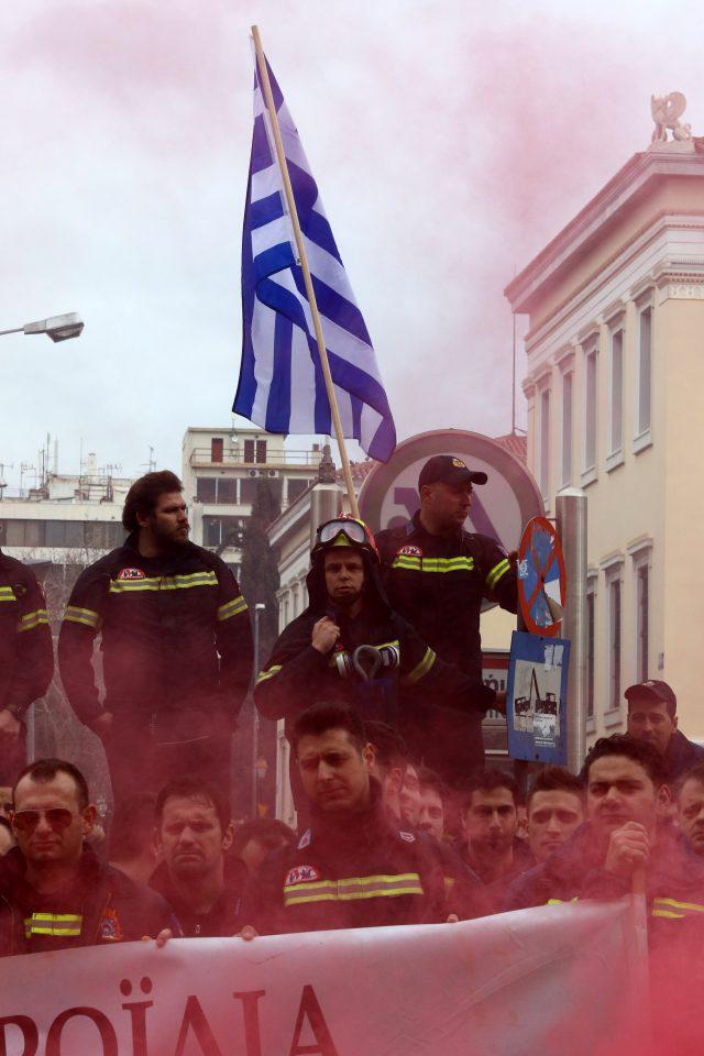 Οι πυροσβέστες πενταετούς υποχρέωσης πραγματοποίησαν πορεία από τη Βουλή μέχρι το Γενικό Λογιστήριο του Κράτους στην Πανεπιστημίου, όπου και άναψαν καπνογόνα και πυρσούς.