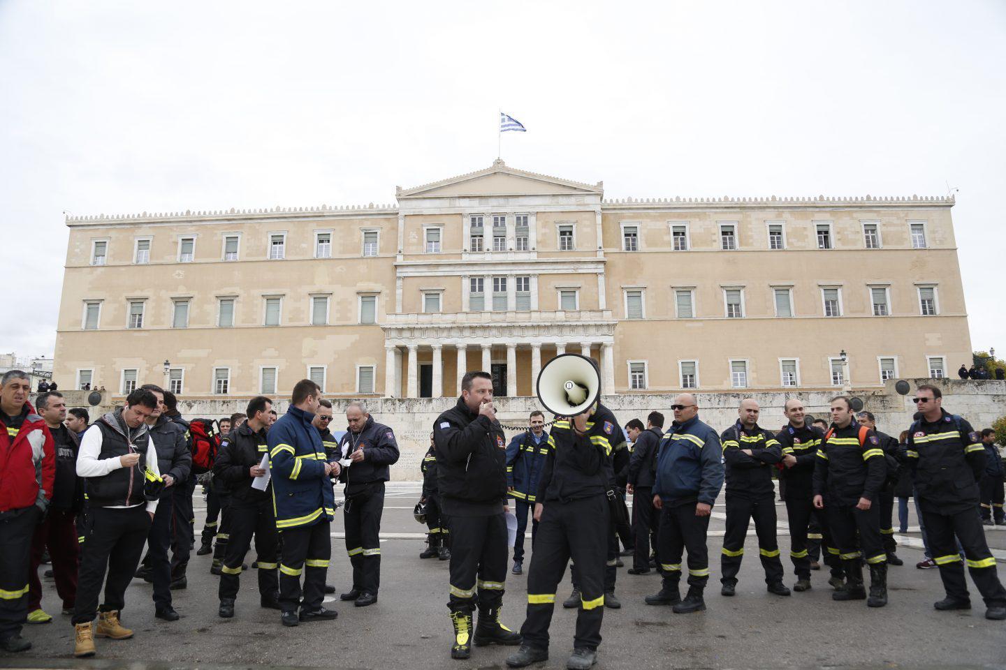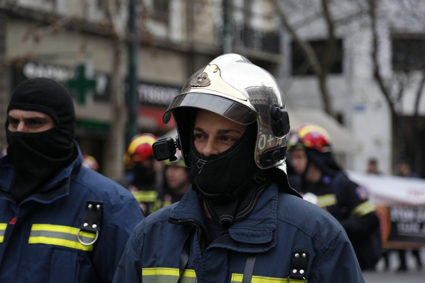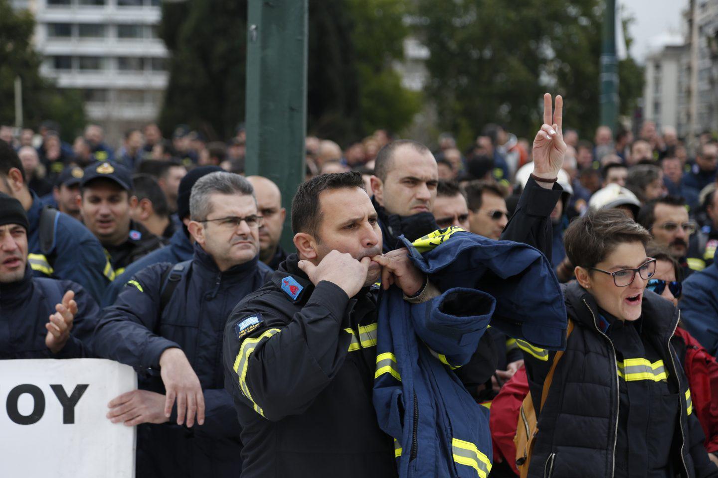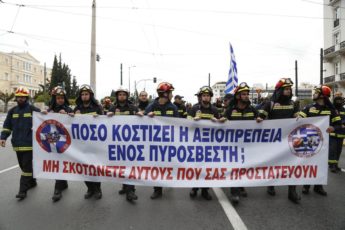 Οι πυροσβέστες πενταετούς υποχρέωσης πραγματοποίησαν πορεία από τη Βουλή μέχρι το Γενικό Λογιστήριο του Κράτους στην Πανεπιστημίου, όπου και άναψαν καπνογόνα και πυρσούς.