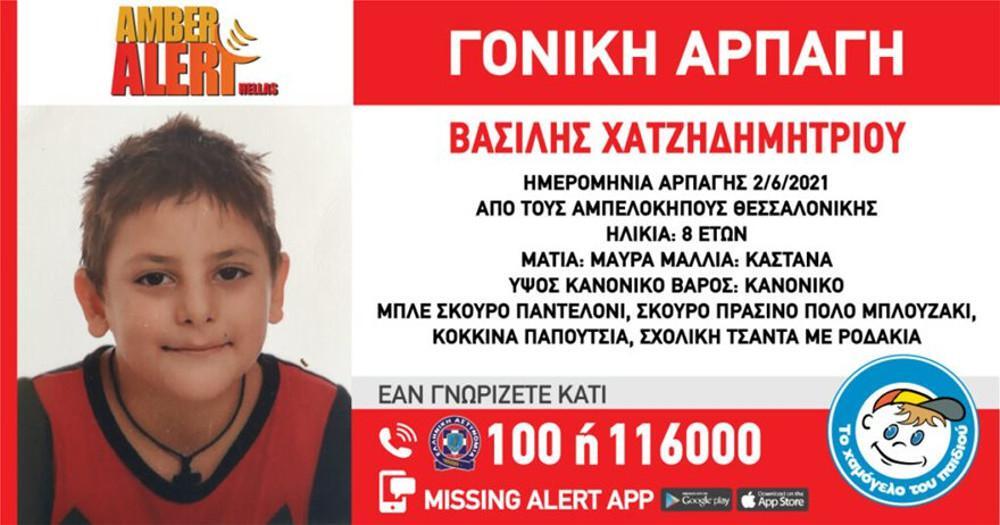 Πρόκειται για τον 8χρονο Βασίλη Χατζηδημητρίου. Ο Βασίλης Χατζηδημητρίου έχει καστανά μαλλιά, μαύρα μάτια, κανονικό ύψος και κανονικό βάρος. Την ημέρα που εξαφανίστηκε φορούσε σκούρο μπλε παντελόνι, σκούρα κοντομάνικη πράσινη μπλούζα τύπου πόλο, κόκκινα παπούτσια και κρατούσε σχολική τσάντα με ροδάκια.