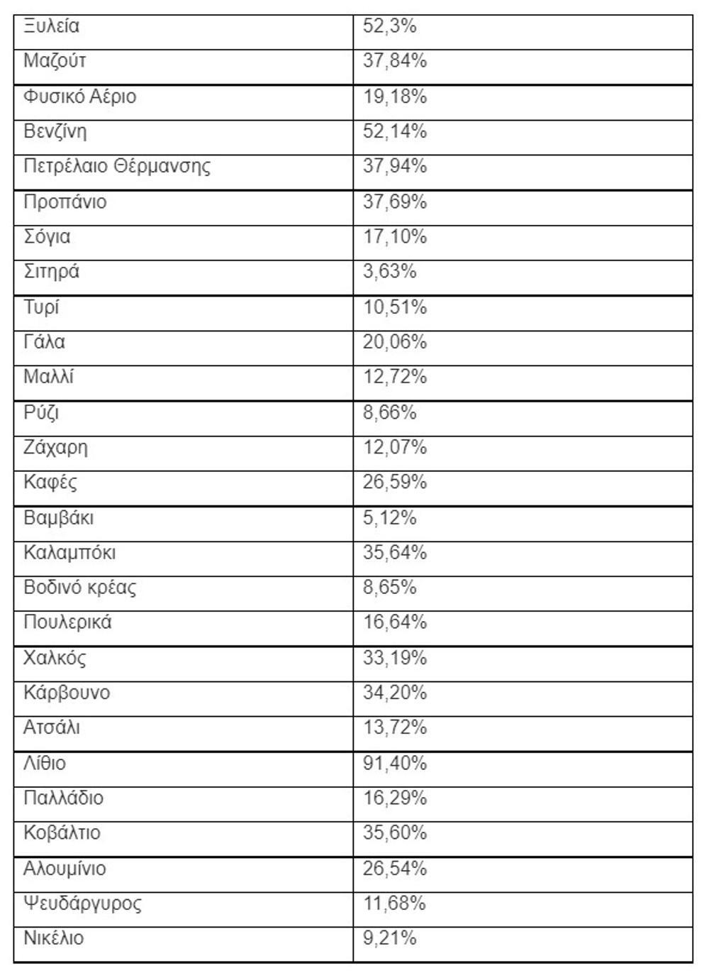 Ενδεικτικά, το πετρέλαιο θέρμανσης έχει αυξηθεί κατά 37,94%, η βενζίνη κατά 52,14%, η σόγια κατά 17,10%, ο καφές κατά 26,59%, το γάλα κατά 20,06%, το καλαμπόκι κατά 35,64%, τα πουλερικά κατά 16,64%, το μαλλί κατά 12,72%, ο χαλκός κατά 33,19%, το αλουμίνιο κατά 26,54% κλπ.