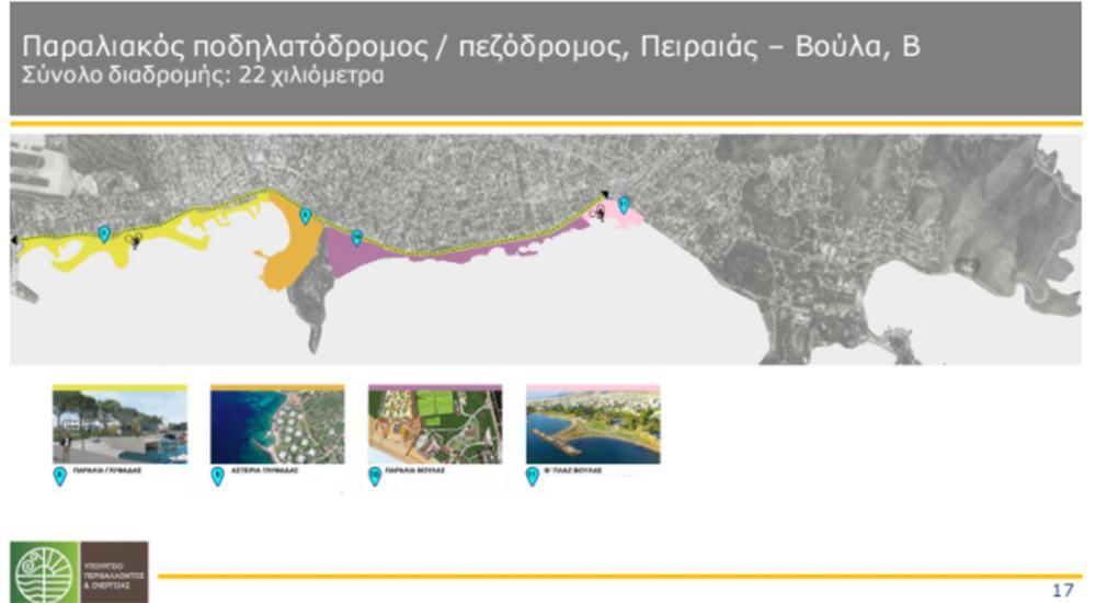 Το έργο θα έχει συνολική έκταση περίπου 70 χιλιομέτρων. Το αστικό κομμάτι θα αποκτήσει ενιαίο ποδηλατόδρομο και πεζόδρομο, ενώ για το υπόλοιπο, από τη Βουλιαγμένη ως το Σούνιο, μήκους 48 χιλιομέτρων, προβλέπεται αναμόρφωση της διαδρομής με ενιαία ανάπλαση.