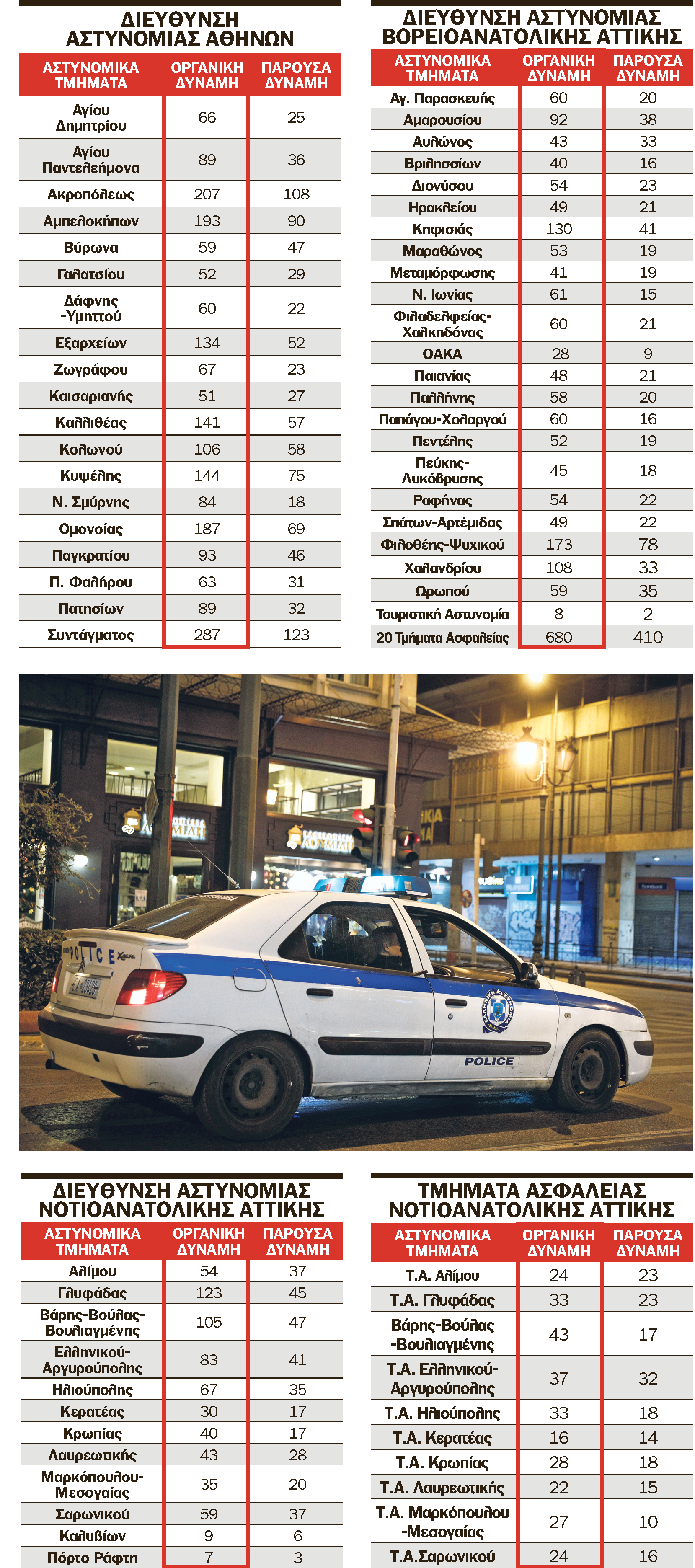 Τα Αστυνομικά Τμήματα της Διεύθυνσης Αστυνομίας Αθηνών έχουν οργανική δύναμη 2.172 αστυνομικών αλλά πραγματική δύναμη μόλις 548, αυτά της Βορειοανατολικής Αττικής έχουν οργανική 1.510 και πραγματική 470, της Νοτιοανατολικής Αττικής οργανική 717 και πραγματική 390, ενώ τα Αστυνομικά Τμήματα της πολύπαθης Δυτικής Αττικής έχουν οργανική δύναμη 1.100 αστυνομικούς αλλά πραγματική μόλις 430. Και όλη αυτή η αστυνομική αποδυνάμωση την ώρα που κάθε λογής εγκληματικές ομάδες αυξάνουν τη δράση τους για να καλύψουν τα χαμένα… έσοδα εξαιτίας των lockdown.
