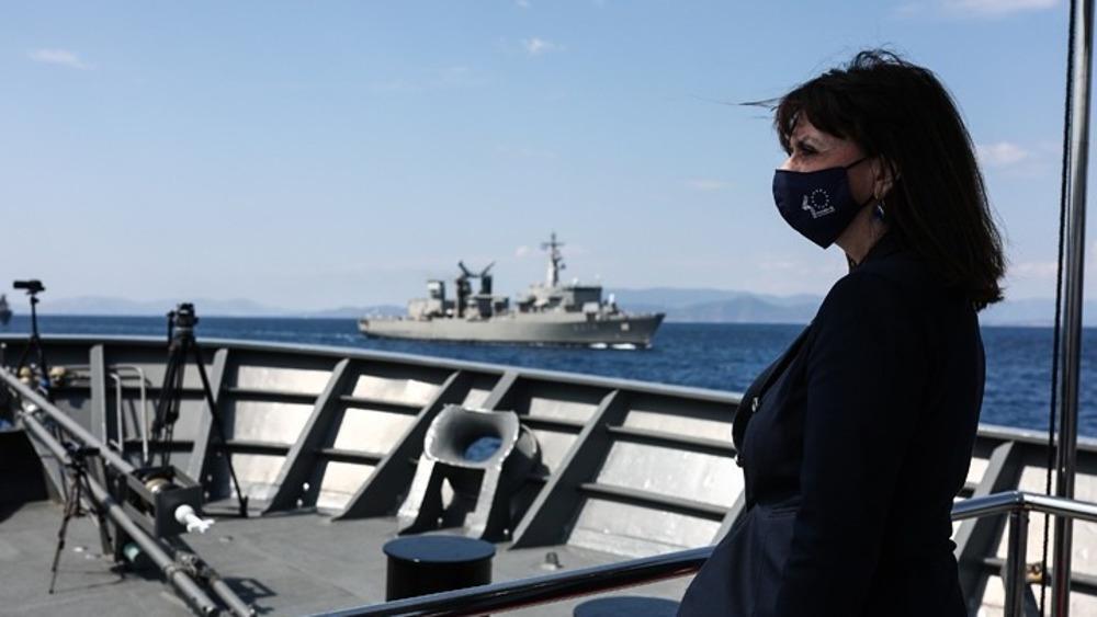 Η κ. Σακελλαροπούλου επιβιβάστηκε στη φρεγάτα «ΥΔΡΑ», όπου την υποδέχθηκαν ο υπουργός Εθνικής ‘Αμυνας Νικόλαος Παναγιωτόπουλος, ο υφυπουργός Εθνικής ‘Αμυνας Αλκιβιάδης Στεφανής, ο αρχηγός ΓΕΕΘΑ Στρατηγός Κωνσταντίνος Φλώρος, ο αρχηγός ΓΕΝ Αντιναύαρχος Στυλιανός Πετράκης, ο αρχηγός Στόλου Αντιναύαρχος Παναγιώτης Λυμπέρης, τα μέλη του Ανώτατου Ναυτικού Συμβουλίου και ο κυβερνήτης της φρεγάτας αντιπλοίαρχος Διονύσης Αρτεμάκης. Όπως τόνισε «εθνική υπερηφάνεια είναι το αίσθημα που κυριαρχεί μετά την επιθεώρηση του Στόλου. Υπερηφάνεια και σεβασμός προς τους άνδρες και τις γυναίκες του Πολεμικού μας Ναυτικού, που υπηρετούν το έθνος με αφοσίωση, υψηλό φρόνημα και αυταπάρνηση». Παράλληλα, υπογράμμισε ότι «οι σύγχρονοι Θεμιστοκλείς υπερασπίζονται με αποτελεσματικότητα τα θαλάσσια σύνορα της πατρίδας μας και της Ευρώπης απέναντι σε προκλήσεις και απειλές της εθνικής μας ακεραιότητας, όπως το καλοκαίρι του 2020, διασφαλίζοντας τα κυριαρχικά μας δικαιώματα. Τους είμαστε ευγνώμονες για την προσφορά τους».