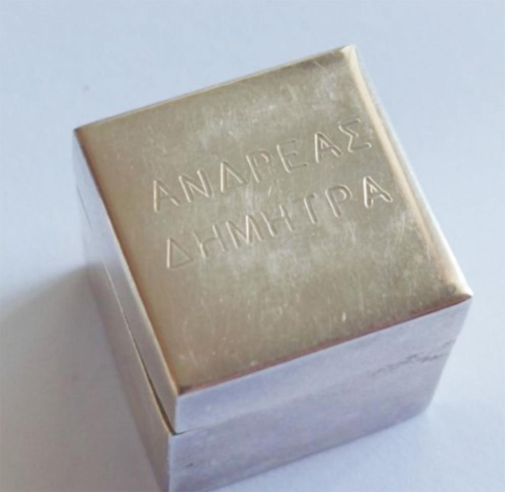Σύμφωνα με το δημοσίευμα, πρόκειται για ένα γαμήλιο κουτί με τα ονόματα των τότε νιόπαντρων «ΑΝΔΡΕΑΣ-ΔΗΜΗΤΡΑ», αρκετά πολυτελές και από πολύ γνωστό αθηναϊκό οίκο, με όλα τα συνοδευτικά εντός του (σφραγίδες, ενθυμήματα κ.λπ.), που διαφημίζεται από το vendora.gr με χορηγούμενη διαφήμιση στο Facebook και μάλιστα διευκρινίζεται ότι υπόκειται και σε δημοπρασία.