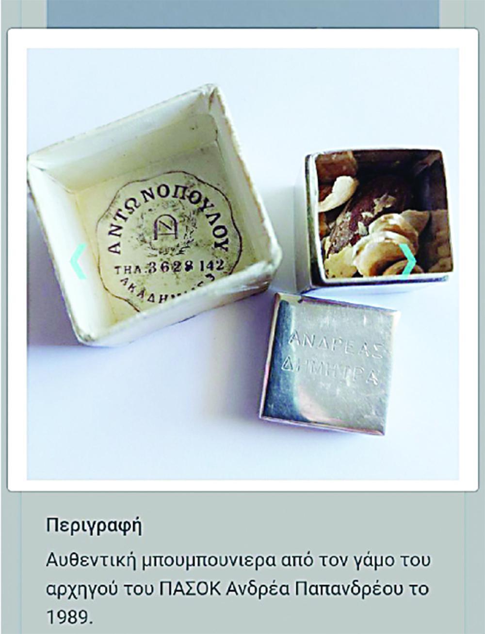 Σύμφωνα με το δημοσίευμα, το αντικείμενο φαίνεται ότι αποκτά ακόμη μεγαλύτερη συλλεκτική αξία καθώς ο πωλητής αποκαλύπτει στο κείμενο της αγγελίας του ότι είναι «κειμήλιο από τον ίδιο τον Ανδρέα Παπανδρέου». Δηλαδή, επί της ουσίας δηλώνει στην αγγελία και τον τρόπο κατοχής της μπομπονιέρας.