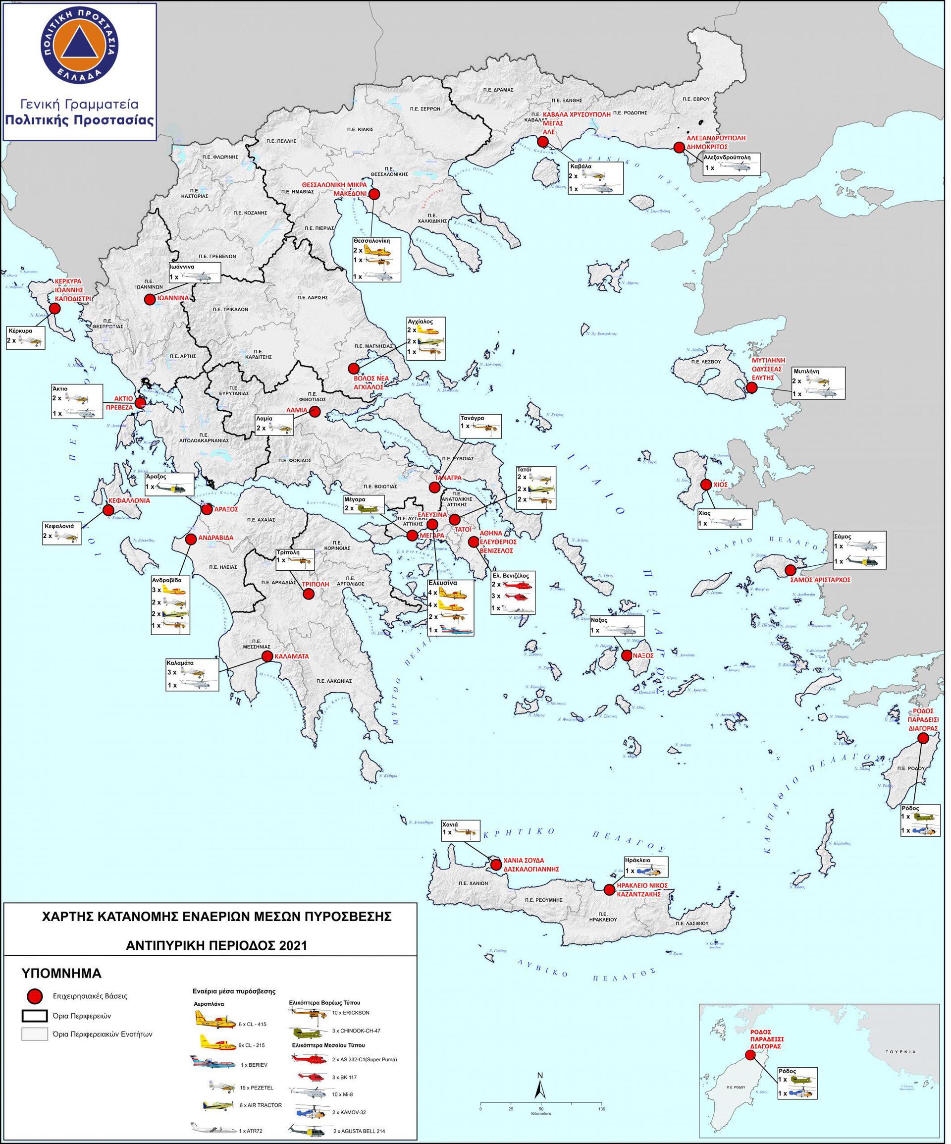 Για το λόγο αυτό ενισχύθηκε φέτος ο στόλος σε σχέση με πέρσι, αριθμώντας συνολικά 69 ελικόπτερα και αεροσκάφη. Τα εναέρια μέσα κατανέμονται σε 25 βάσεις που καλύπτουν το σύνολο της επικράτειας ενώ για πρώτη φορά φέτος εδρεύει στη Θεσσαλονίκη ένα ελικόπτερο βαρέως τύπου (Etickson) το οποίο θα ενισχύει την επιχειρησιακή δυνατότητα στη Βόρεια Ελλάδα.