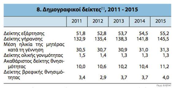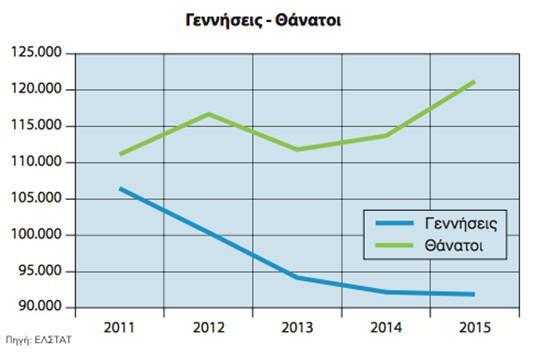 Η χώρα μας προφανώς και δεν ξεφεύγει από την τάση αυτή της ευρωπαϊκής ηπείρου. Το 2015 (τελευταία χρονιά με δεδομένα από την ΕΛΣΤΑΤ) ο ρυθμός γεννήσεων ήταν 1,3 και ο δείκτης εξάρτησης, δηλαδή η αναλογία του μη οικονομικά ενεργού πληθυσμού προς τον οικονομικά ενεργό, συνέχισε να αυξάνεται φτάνοντας στο 55,2. Η εικόνα αποτυπώνεται πιο ξεκάθαρα κοιτώντας τη διαφορά μεταξύ συνολικών γεννήσεων και θανάτων. Το 2015 στην πατρίδα μας είχαμε μείωση του συνολικού πληθυσμού κατά 29.000 και πλέον συμπολίτες μας, με την τάση να δείχνει πως θα συνεχιστεί αυτή η αρνητική διαφορά και τα επόμενα χρόνια.