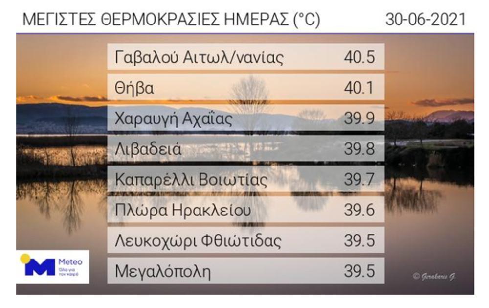 Για ένατη συνεχόμενη ημέρα σημειώθηκαν σήμερα πολύ υψηλές για την εποχή θερμοκρασίες στη χώρα μας, ιδίως σε Αιτωλοακαρνανία, Αχαΐα και Βοιωτία. Οι υψηλότερες μέγιστες θερμοκρασίες καταγράφηκαν στη Γαβαλού Αιτωλ/νίας με 40,5 βαθμούς κελσίου και ακολούθησαν Θήβα (40,1), Χαραυγή Αχαΐας (39,9) και Λειβαδιά (39,8), σύμφωνα με το δίκτυο των αυτόματων μετεωρολογικών σταθμών του Εθνικού Αστεροσκοπείου Αθηνών/meteo.gr.