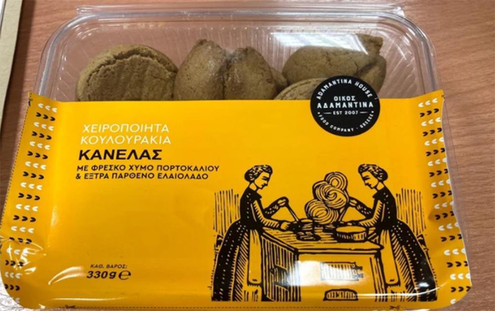 - «ΧΕΙΡΟΠΟΙΗΤΑ ΚΟΥΛΟΥΡΑΚΙΑ ΚΑΝΕΛΑΣ, ΜΕ ΦΡΕΣΚΟ ΧΥΜΟ ΠΟΡΤΟΚΑΛΙΟΥ ΚΑΙ ΕΞΤΡΑ ΠΑΡΘΕΝΟ ΕΛΑΙΟΛΑΔΟ», με την επωνυμία «ΟΙΚΟΣ ΑΔΑΜΑΝΤΙΝΑ», με ημερομηνία ελάχιστης διατηρησιμότητας 09-03-2022 και αριθμό παρτίδας Α.Π. 7159 και